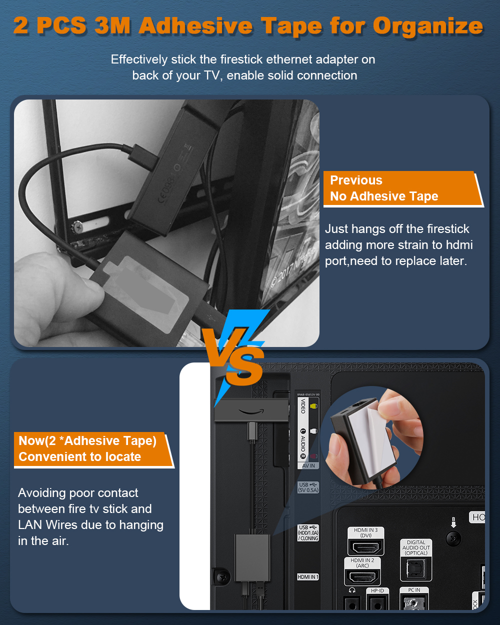 이제(2*접착 테이프) 찾기가 편리합니다. 공중에 매달려 있는 것 때문에 Fire TV 스틱과 LAN 전선 사이의 접촉 불량을 방지합니다.