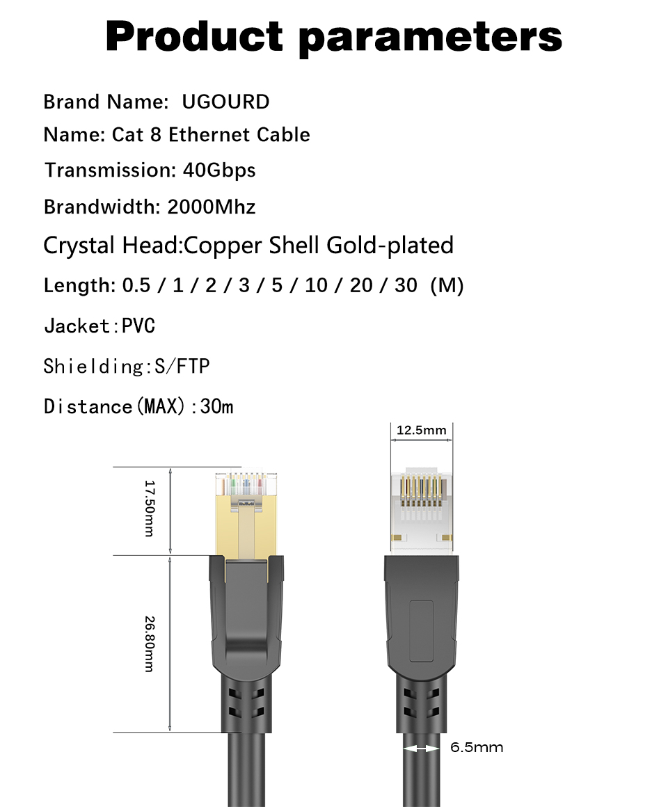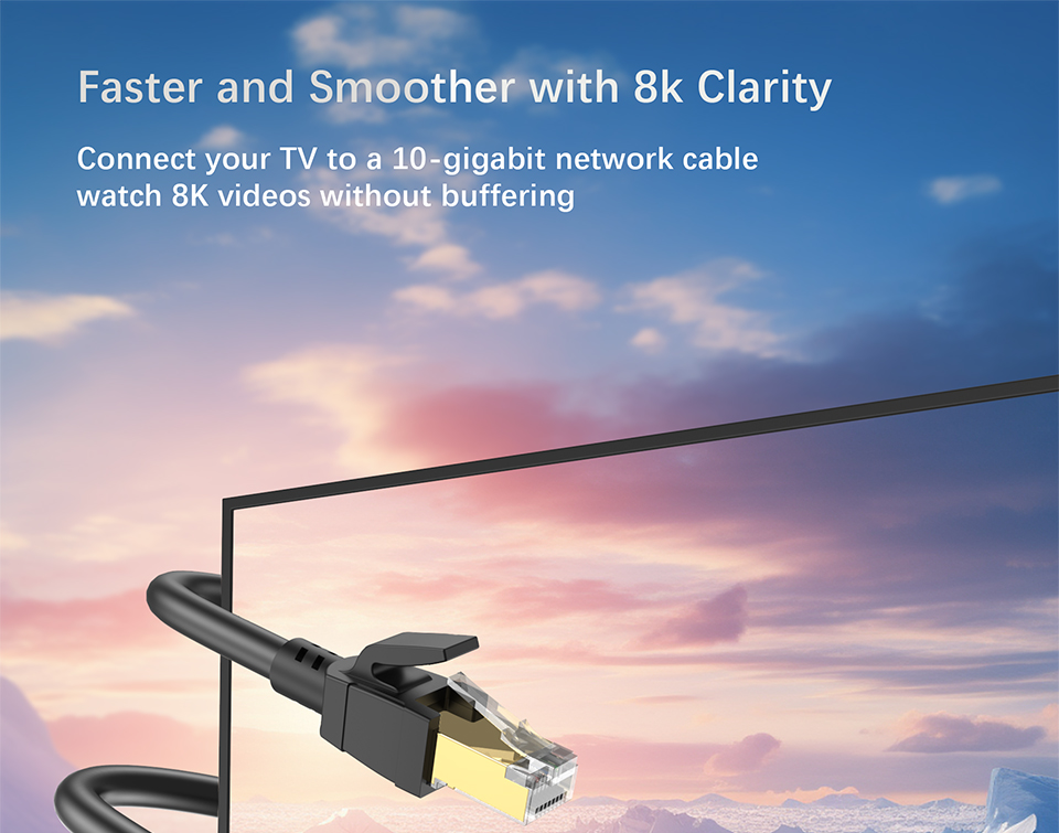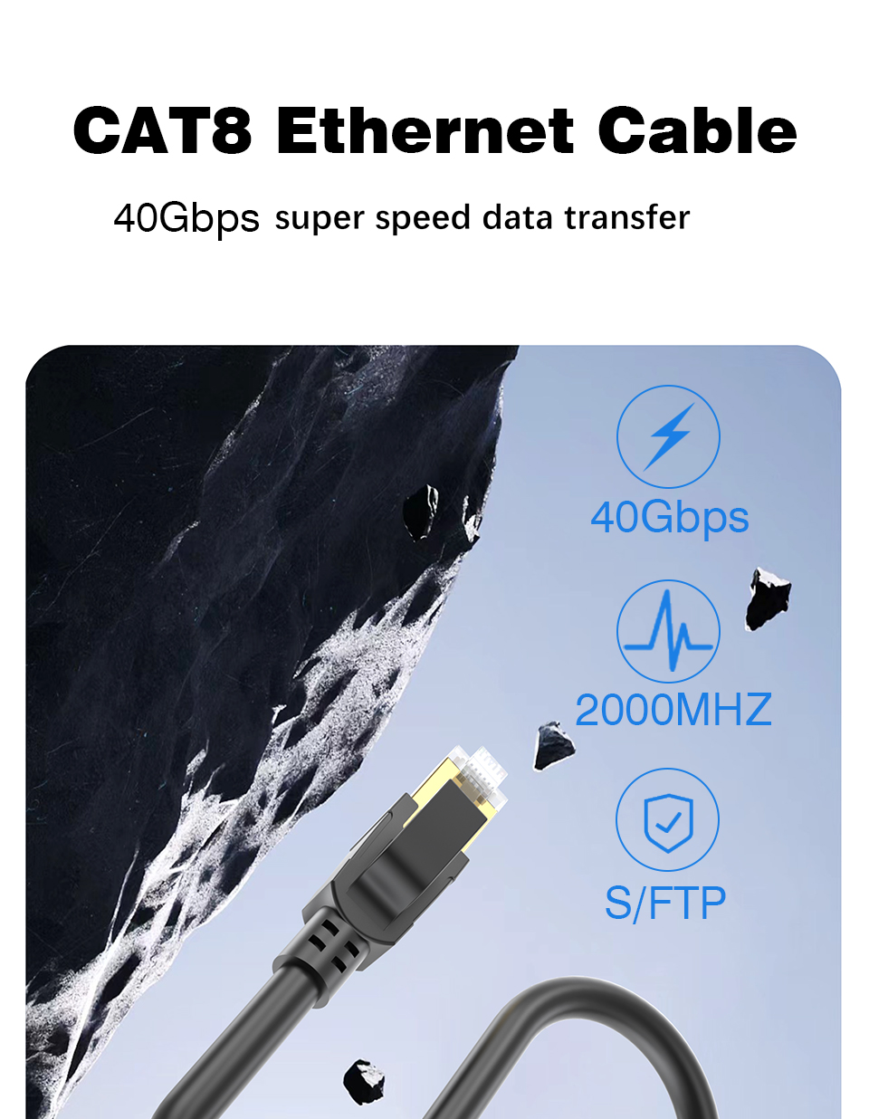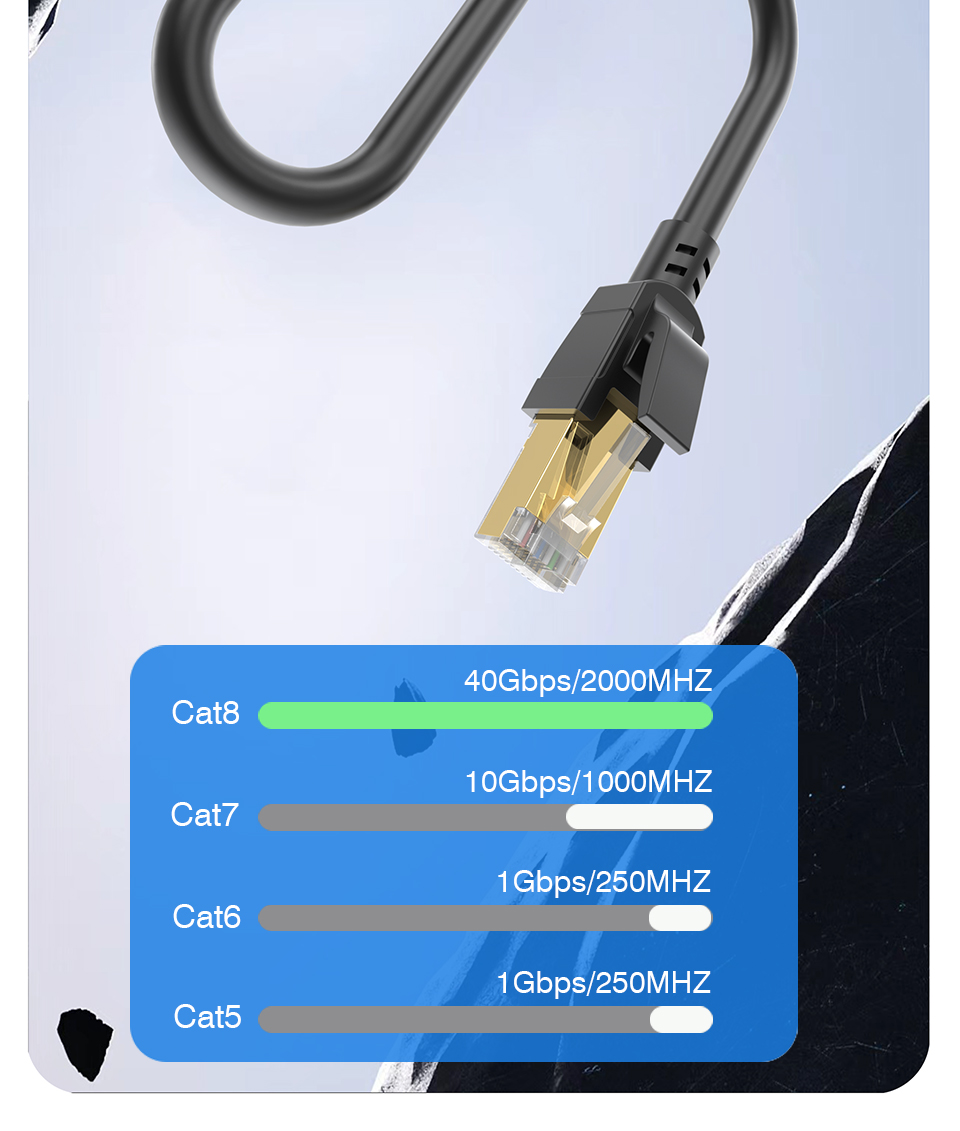 CAT8 이더넷 케이블은 40Gbps의 데이터 전송 속도와 2000MHz의 대역폭을 지원합니다.고속 특성으로 인해 데이터 업로드 및 다운로드 속도가 빨라지므로 기업, 정부 건물, 쇼핑몰 및 사무실 건물에서 대체할 수 없는 이점이 됩니다.