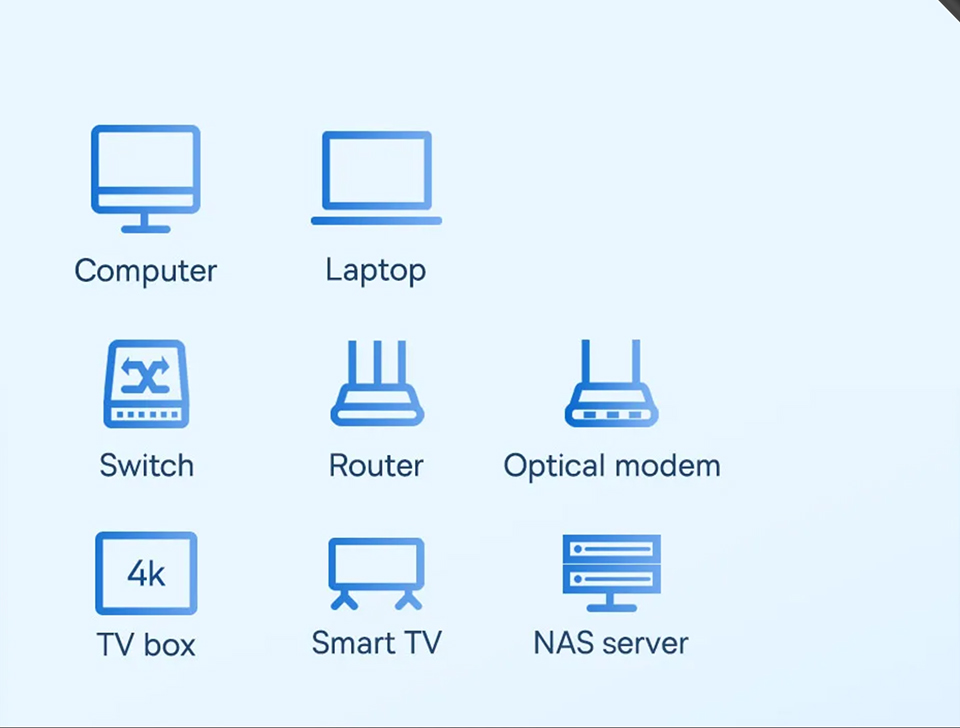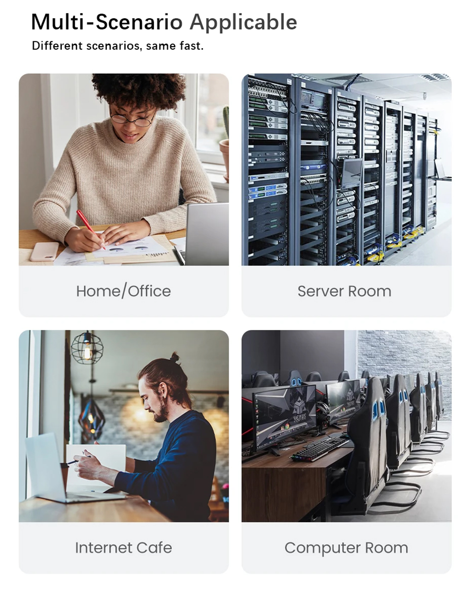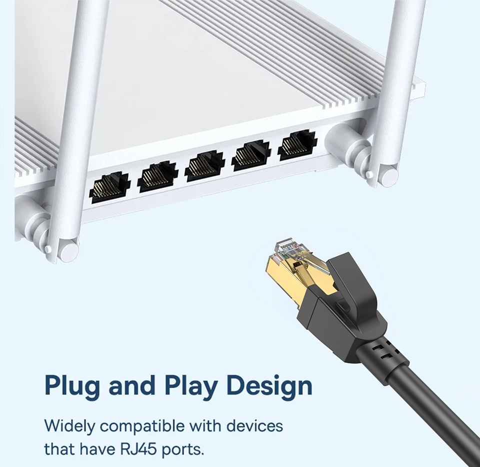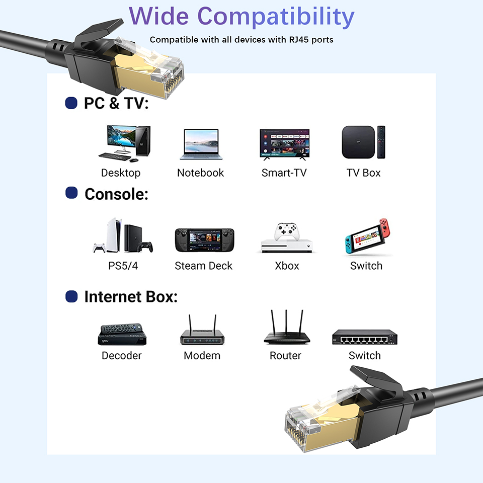 CAT8은 Cat7, Cat6e, Cat6, Cat5e 및 Cat5 이더넷 케이블과 역호환됩니다.Cat 8 이더넷 케이블은 컴퓨터, 노트북, 모뎀, 라우터, PS5, PS4, PS3, X-Box 360, X-Box One, 스위치, 네트워크 어댑터 및 기타 네트워킹 장치와 완벽하게 호환됩니다.
