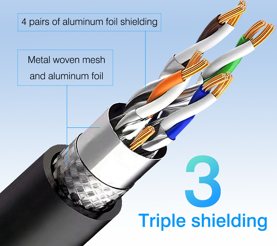 4쌍의 알루미늄 호일 차폐 및 연선을 사용한 케이블 설계는 와이어 코어 간의 누화를 줄일 수 있습니다. 와이어 코어는 무산소 구리로 만들어졌으며 전도성이 높고 손실이 적습니다.전체적인 차폐는 금속으로 짠 메쉬와 알루미늄 호일의 이중 차폐로 외부 간섭을 방지합니다.신호 안정성을 보장하고 데이터 전송 손실을 줄이기 위해 총 3개의 차폐(S/FTP)가 사용됩니다.