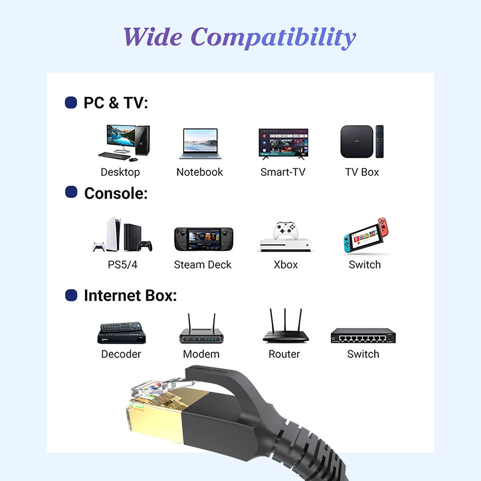 ?Performance: The bandwidth can reach 40Gbps, the transmission frequency is 2000MHz, and the wire has undergone multi-layer shielding treatment for stable transmission and strong anti-interference ability; This is an ultra high speed RJ45 cable suitable for shopping malls, offices, entertainment venues, etc.