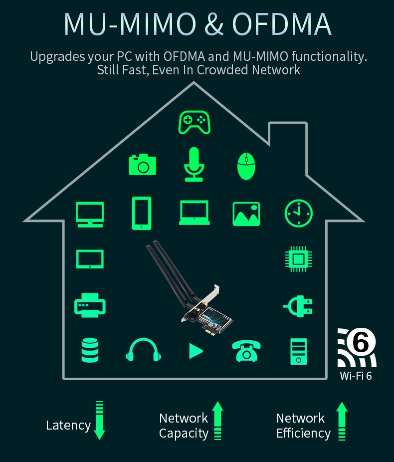 Wi-Fi 6 어댑터로서 2x2 MU-MIMO 안테나를 통한 802.11ax 와 2.4 Gbps 의 최고 대역폭을 지원하며 5 GHz 및 2.4 GHz 대역을 모두 지원합니다.