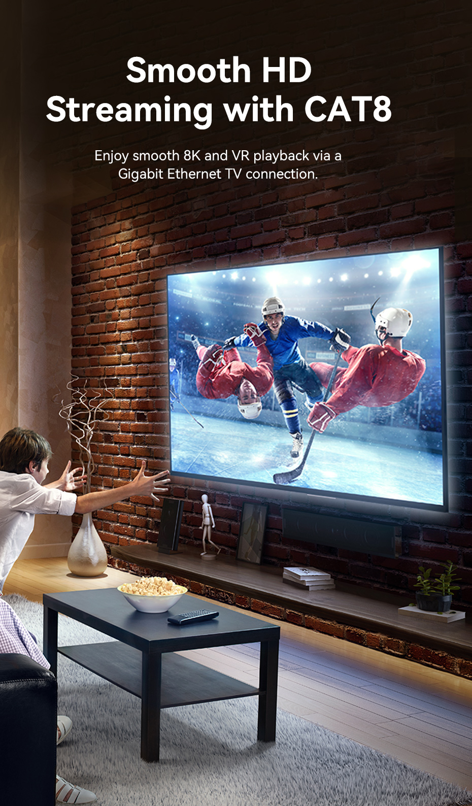 기가비트 이더넷 TV 연결을 통해 부드러운 8K 및 VR 재생을 즐기십시오.