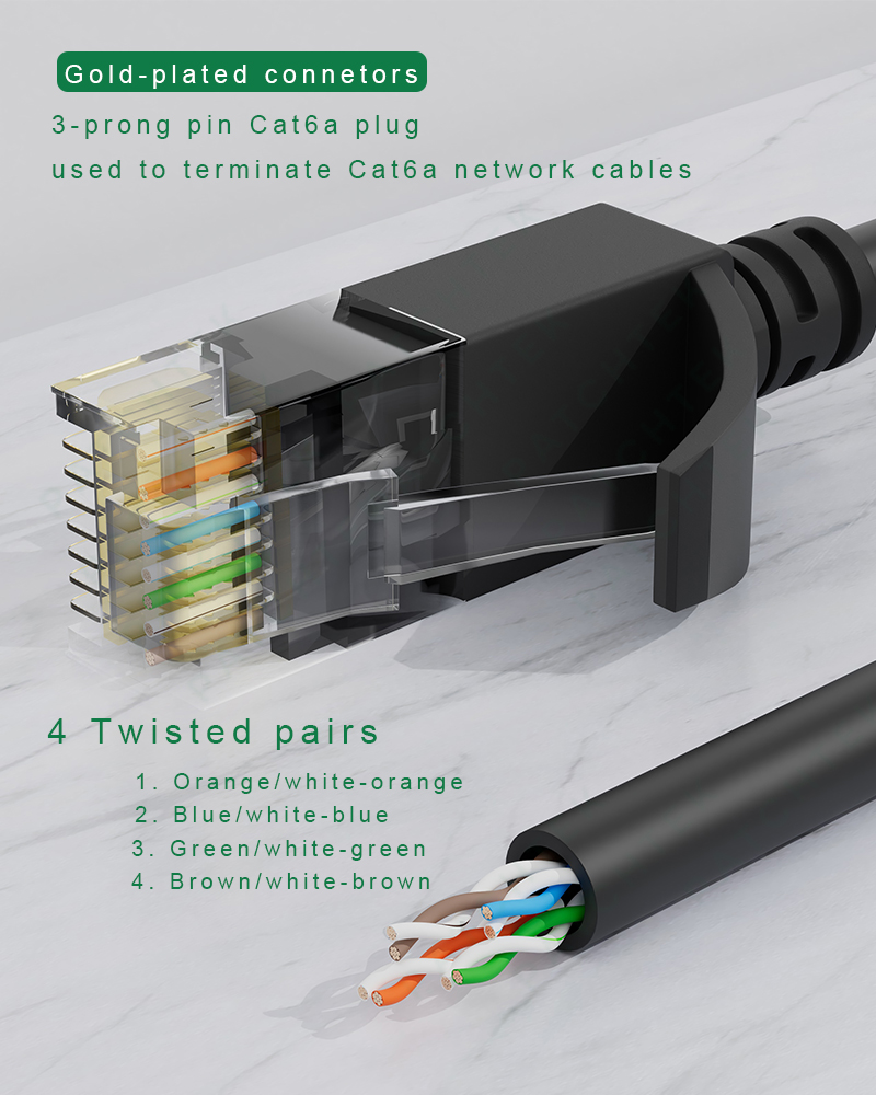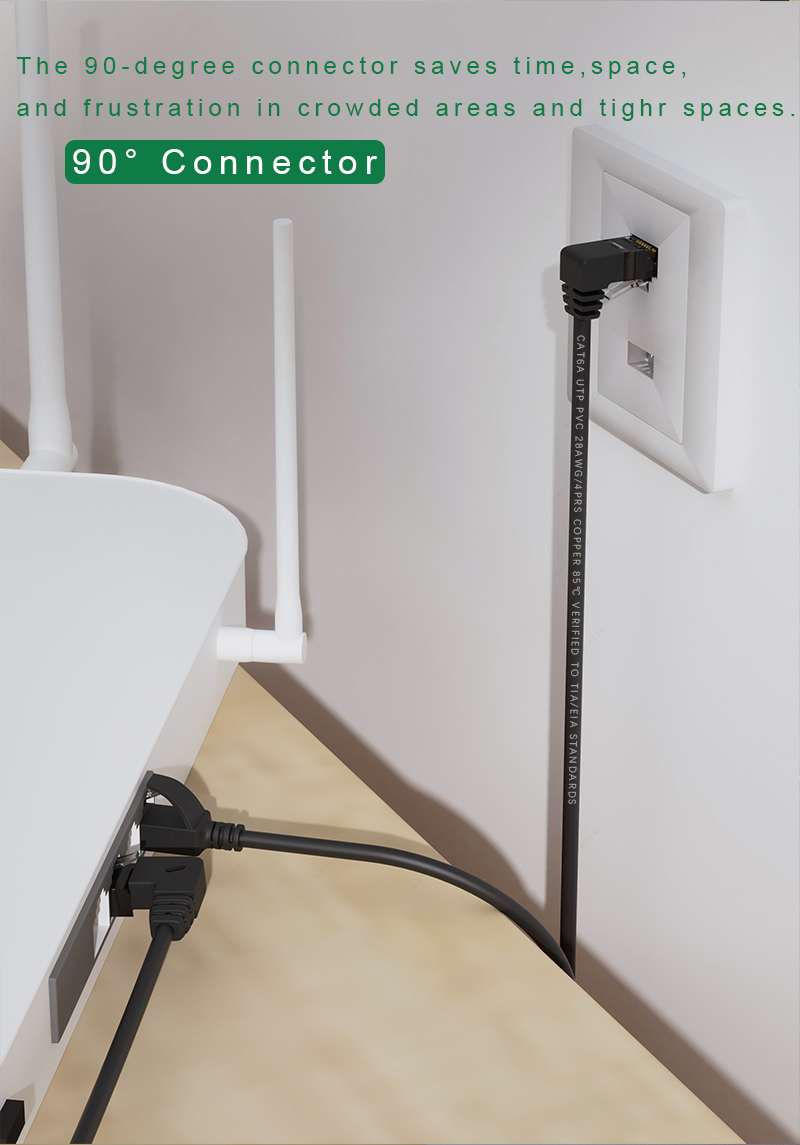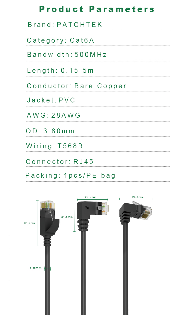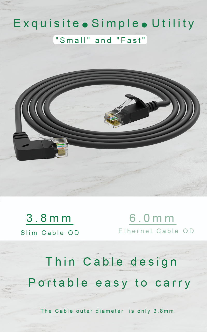 Cat6a UTP 90도 각도 초박형 패치 케이블은 카테고리 6a 고성능(10Gbps) 기능을 갖추고 있습니다.| 1-500MHz)이지만 직경이 3.8mm에 불과한 매우 작은 직경의 패치 코드입니다. 당신이 선택한 4개의 90도 각도.매우 유연한 수정 PVC 재킷으로 -40도에서 +85도까지 작업이 가능합니다.각 끝에 비차폐 8p8c RJ45 수 커넥터와 4개의 꼬인 비차폐 쌍 28AWG(7/0.12mm) 순동선으로 구성됩니다.일반적으로 패치 패널, 스위치, 컴퓨터 및 라우터와 같은 10기가비트 이더넷 또는 이전 cat6, cat5e 및 cat5 네트워크 연결에 사용됩니다.모든 케이블은 포장 전에 100% 테스트를 거쳤습니다.