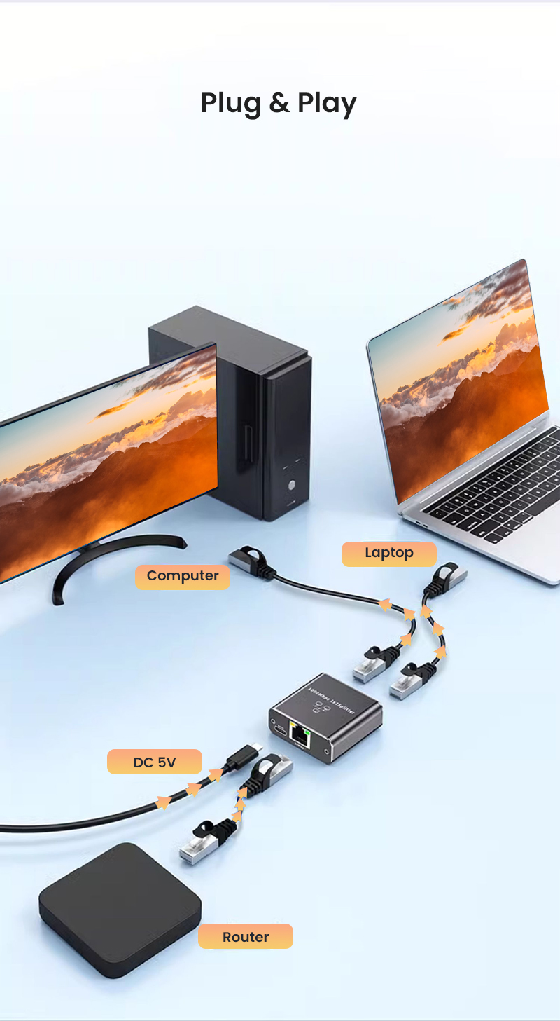 이 기가비트 이더넷 스플리터는 배선 부족으로 인한 연결 문제를 해결하기 위해 특별히 설계되었습니다.포함된 USB 케이블로 전원을 공급받는 이 장치는 단일 이더넷 회선을 동시에 공유하는 두 대의 컴퓨터를 지원하므로 간단하면서도 효율적인 네트워크 분배기가 됩니다.이는 네트워크 확장을 위한 편리한 솔루션을 제공합니다.