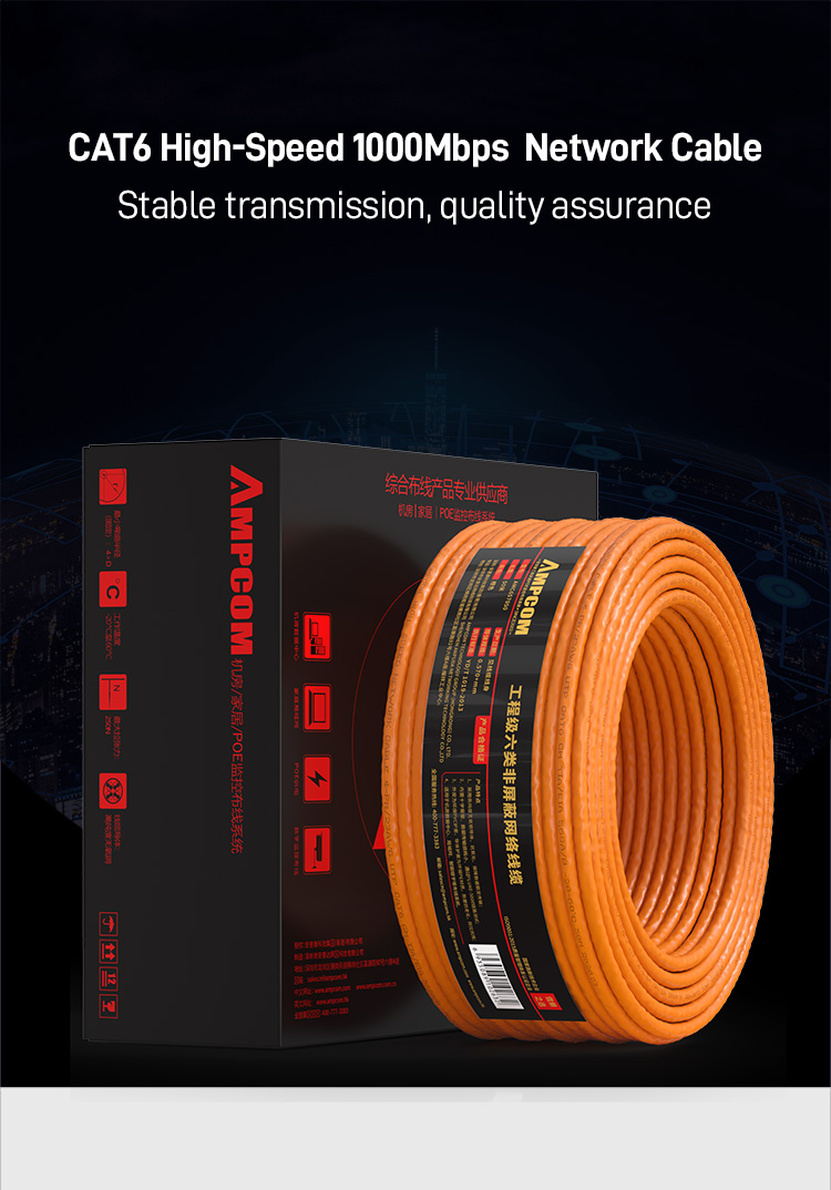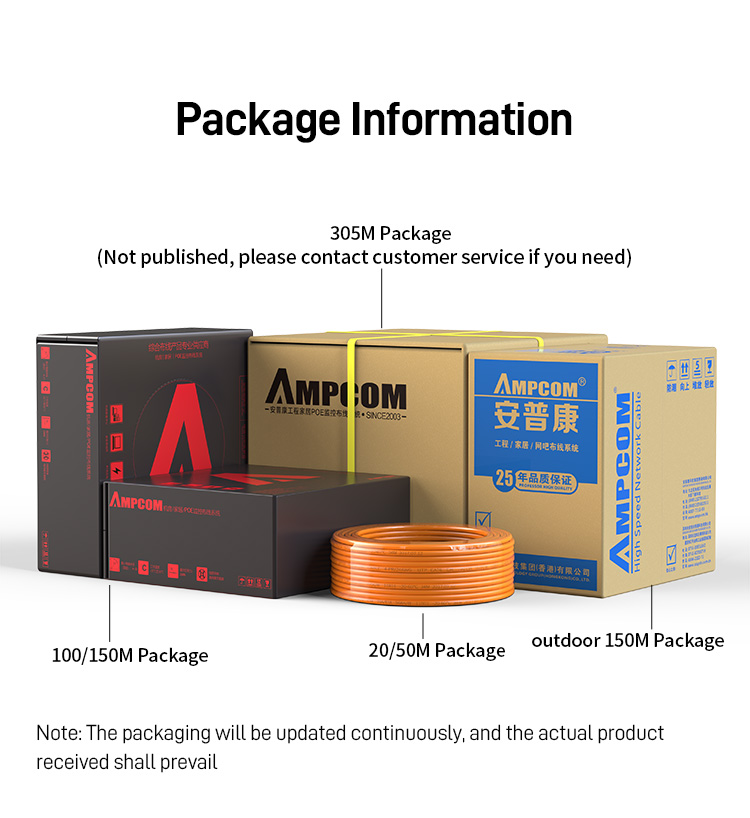2. 엉킴이 없고 번거롭지 않은 간편한 풀 박스 포장: 부드럽고 유연하며 매우 쉬운 설치에 적합합니다."25M/50M/100M/150M 케이블에는 ""M"" 카운트가 있으므로 케이블 측정이 매우 쉽습니다."케이블은 상자에서 당겨 빼거나 상자에서 꺼내어 어깨에 걸어 당겨서 설치할 수 있습니다.