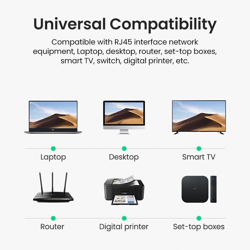 최대 550Mhz 대역폭의 최대 데이터 전송을 지원합니다.라우터, 노트북, 컴퓨터, 모뎀, 프린터, 스캐너, 스마트 TV, 네트워크 스위치 및 게임 콘솔(예: 이더넷)과 같은 매우 긴 네트워크 케이블 요구 사항에 적합합니다.PS4/PS5/Xbox One/Xbox 360).