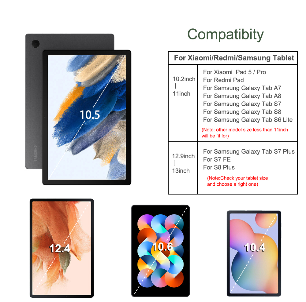 IPad Air/ 2 /3 / 3 Pro/4/ 5,iPad Pro 10.5 2017 ,iPad Pro 11,iPad 4/ 5/6, iPad 7/8/9 10.2, 아이패드 10 10.9, 아이패드 미니 4 5 6, 샤오미 패드 5/프로 11 인치/홍미 패드/홍미 패드 SE 2023, 삼성 갤럭시 탭 A7 /A7 라이트/A8 /S7 /S8/ S6 라이트/S9 /S9 FE /A9 플러스, 레노버 탭 M10, 레노버 탭 M10 플러스, 화웨이 메이트 패드 11 11 인치