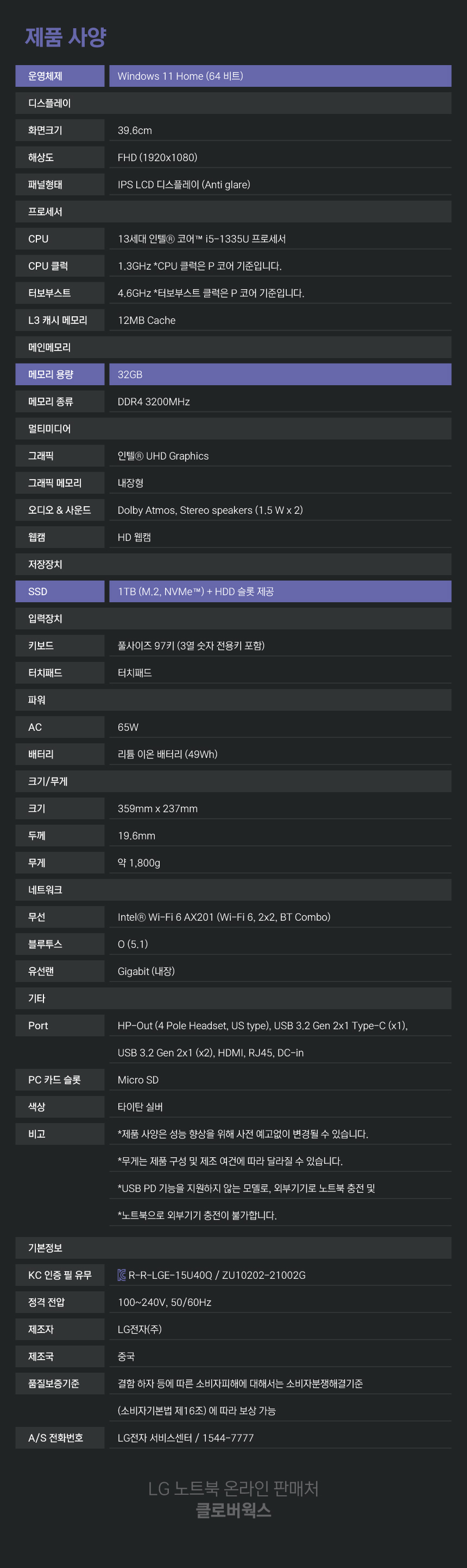 LG 2023 울트라PC 15U50R-GR56K i5-1335U 32GB 1TB WIN11 / 사무용 인강용 업무용 대학생 가성비 노트북