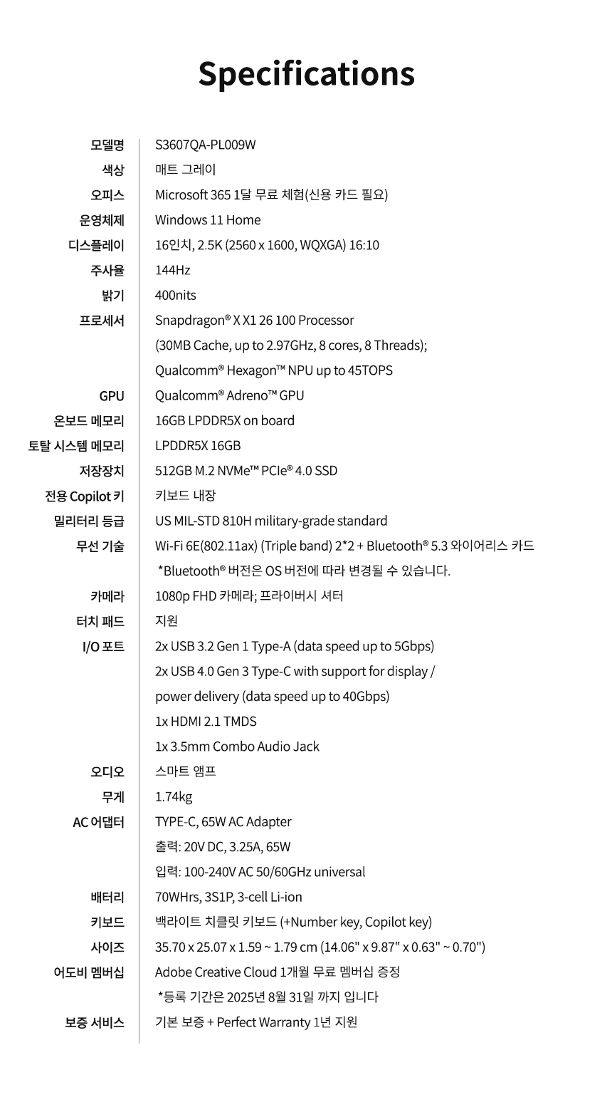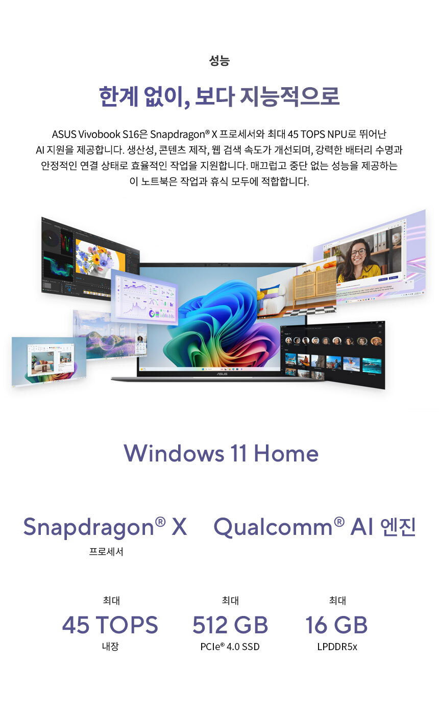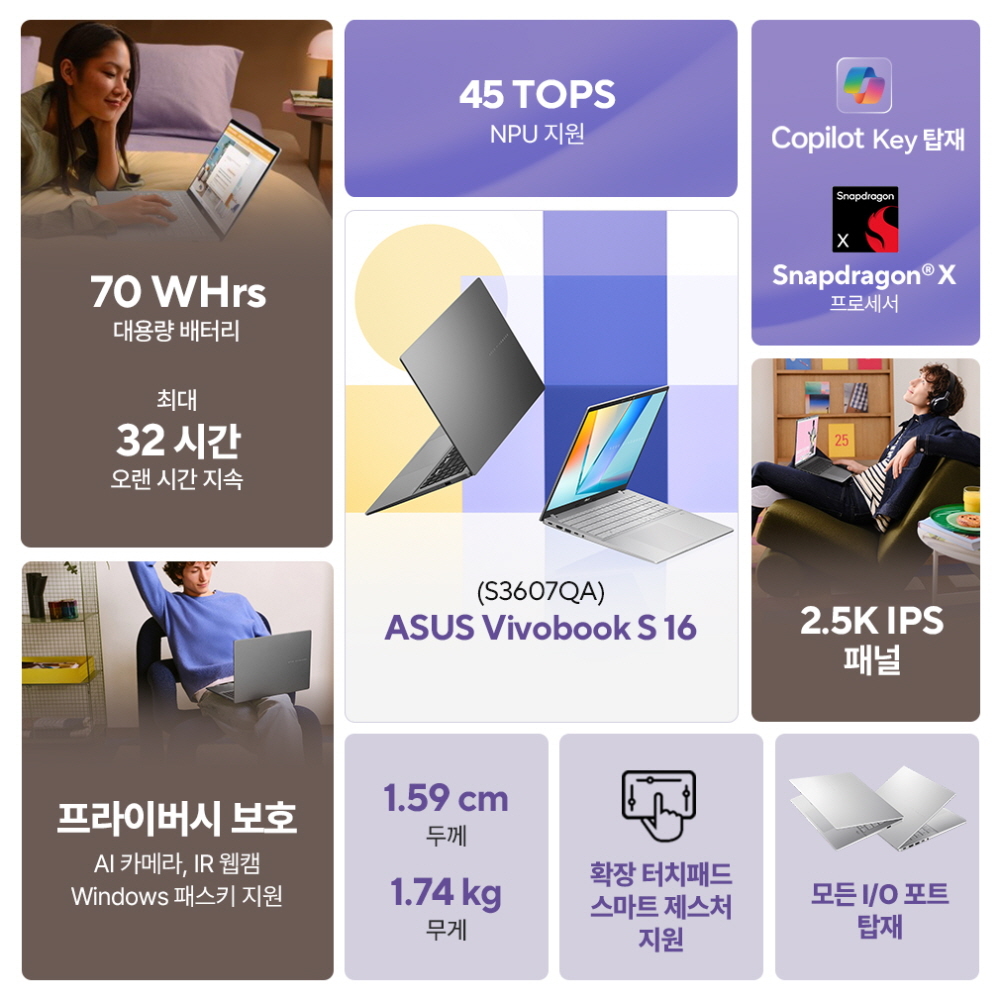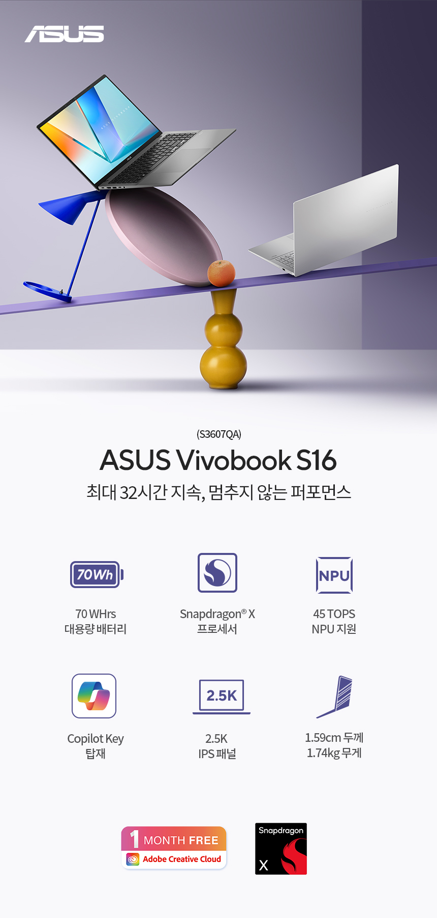 에이수스 정품 ASUS 비보북 S3607QA-PL009W 스냅드래곤X 윈11탑재 램16GB SSD512GB 3종사은품 당일출고 AI