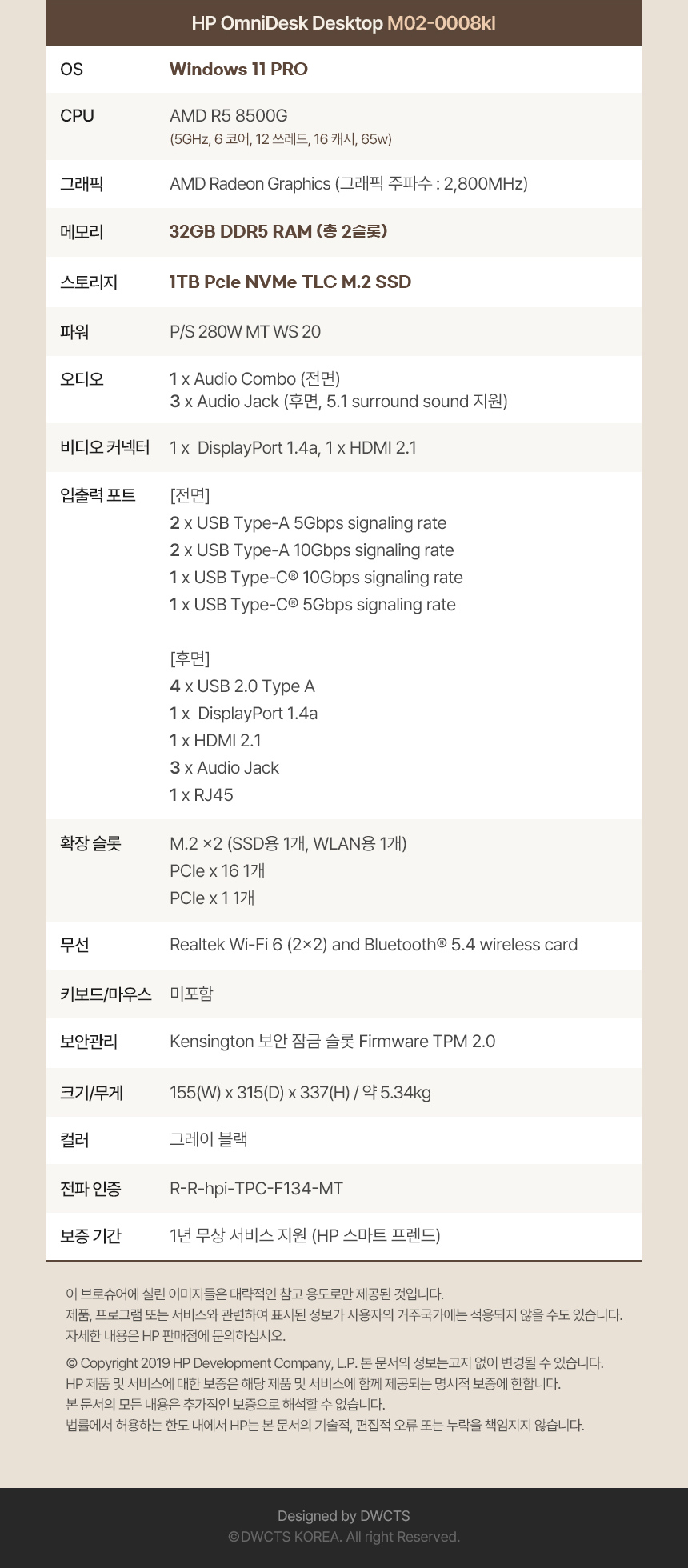 HP 옴니데스크 M02-0008kl 32GB 1TB WIN11 / 사무용 인강용 가성비 가정용PC 데스크탑