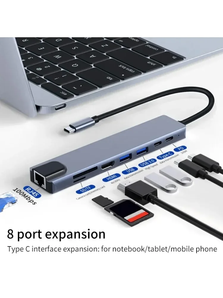 USB 타입 C 허브 어댑터 SD Tf Rj45 카드 리더기 노트북 컴퓨터용 Pd 고속 충전 8 in 1 3 1 to 4k HDMI