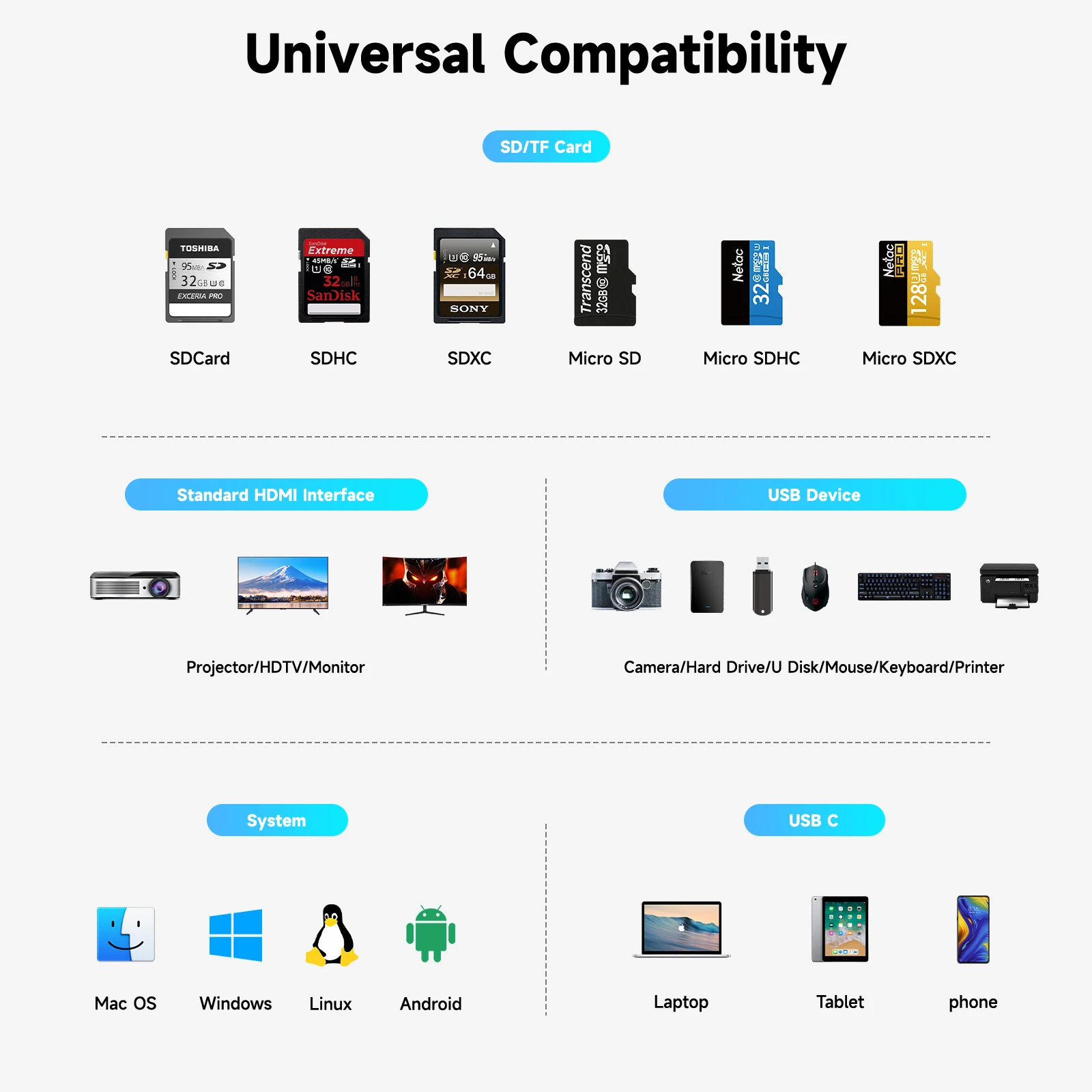 | Compatible devices | TV, projectors,monitor., SD, SDHC, SDXC; MicroSD, MicroSDHC, Micro SD |