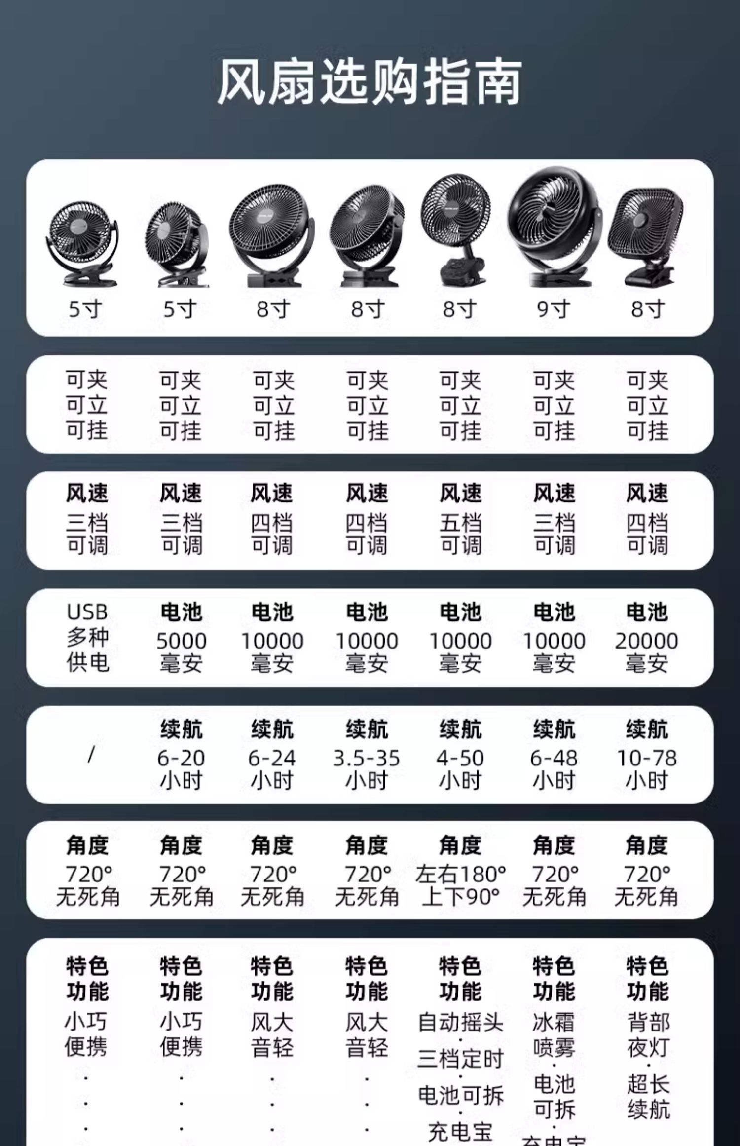 색상 분류 : 7 8인치 50H 항속 고개를 갸우뚱 있는 밍 5단 순환 냉풍 클래식 블랙 ![]() | 색상 분류 : 8 8인치 78H 주행거리 LED 라이트 4단 순환 냉풍 클래식 블랙 ![]() |