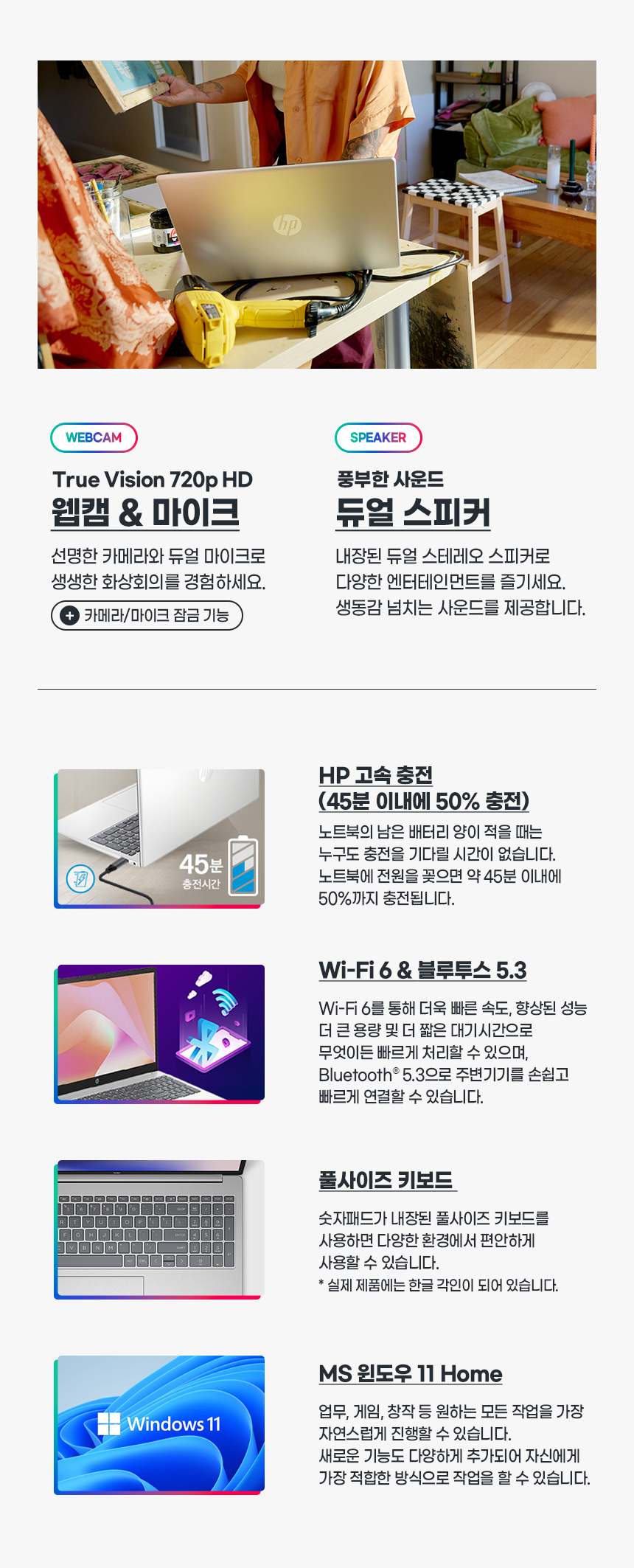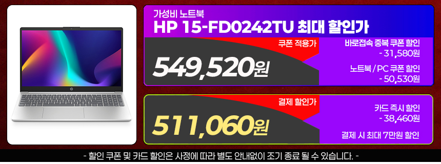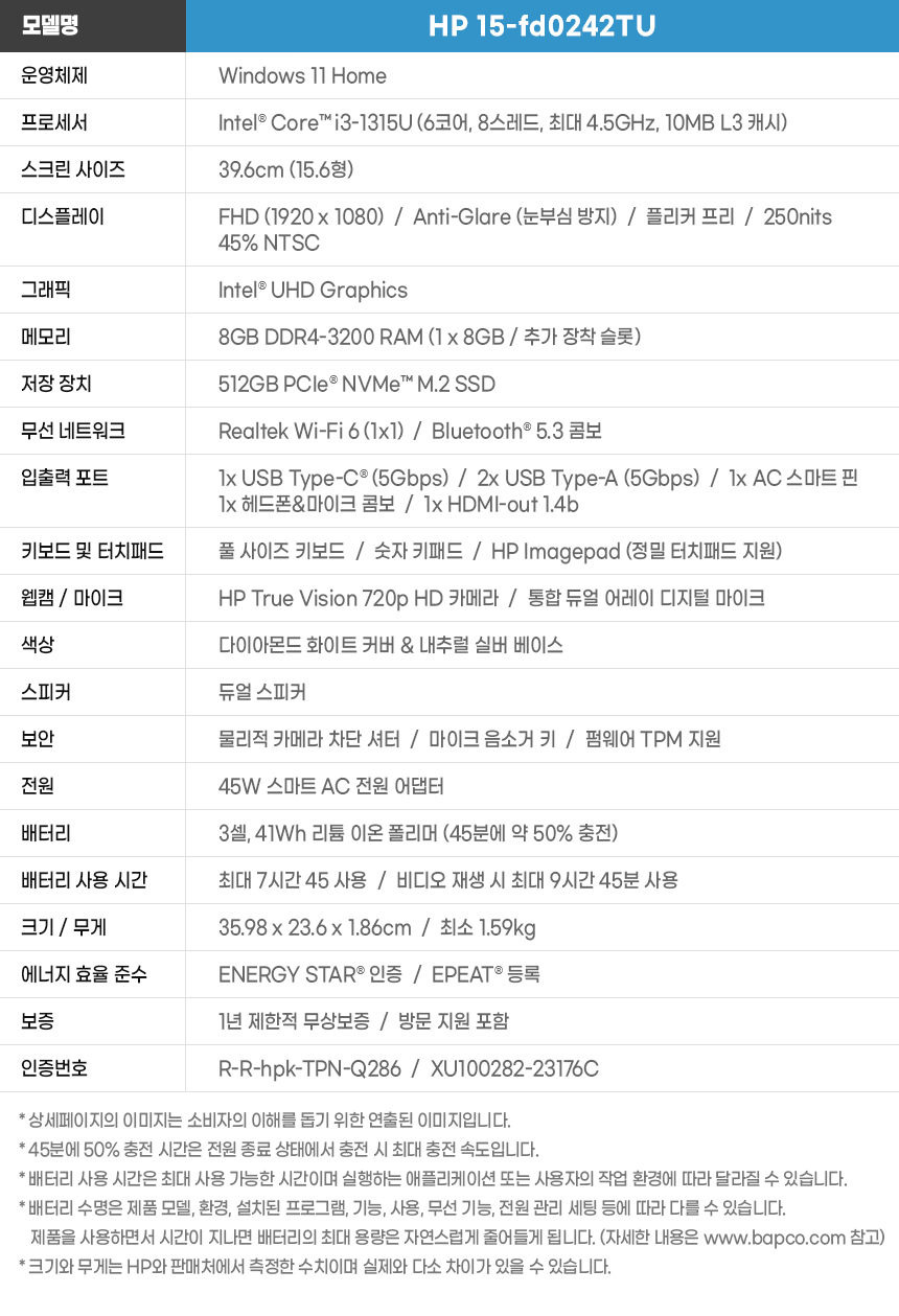 HP 15-fd0242TU 최종51만원대+무선 마우스 증정. 인텔 i3-1315U / 8GB / 512GB / Win11 / 가성비 노트북