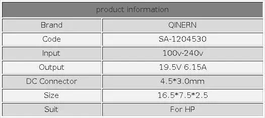 | Laptop input or Adapter output | 19.5v 6.15A 120W |