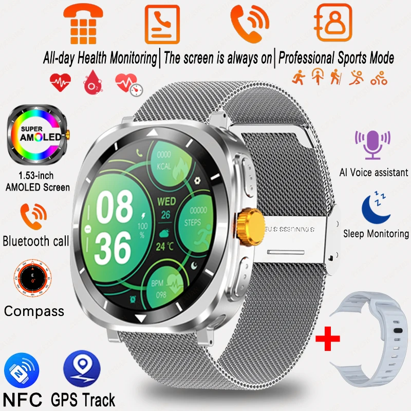 친애하는 친구 귀하의 지원에 대단히 감사 이것은 다기능 스마트 시계입니다 이 제품에는 많은 유용한 기능이 예를 들어 NFC 기능을 사용하면 시계를 통해 문을 열 수 블루투스 통화 기능을 사용하면 휴대 전화의 블루투스에 연결 한 후 직접 전화를 걸 수 AI 음성 비서 기능 음성을 통한 시계 기능 실현 스포츠 모드 기능은 운동 시간 거리 걸음 수 칼로리 소비 변화 등을 실시간으로 모니 또한 체온 수면 산소 및 수를 모니 하여 항상 건강을 지켜 볼 수있는 몇 가지 보조 기능이 이들은 매우 유용한 기능입니다