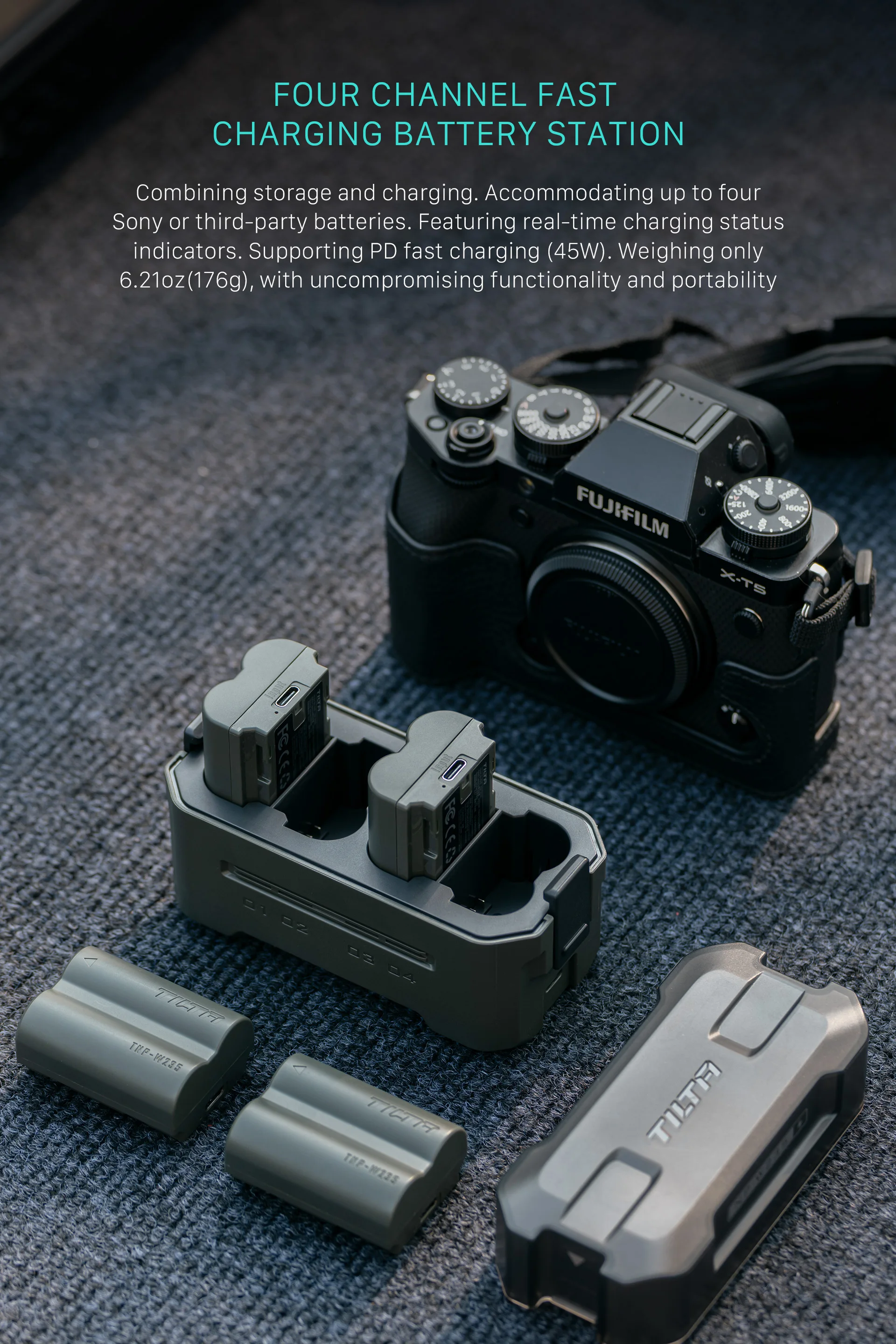 Tilta 휴대용 충전 스테이션은 Tilta의 시그니처 미학을 갖춘 스타일 디자인을 갖추고 있어 장비에 세련되고 기능적인 추가 기능을 제공