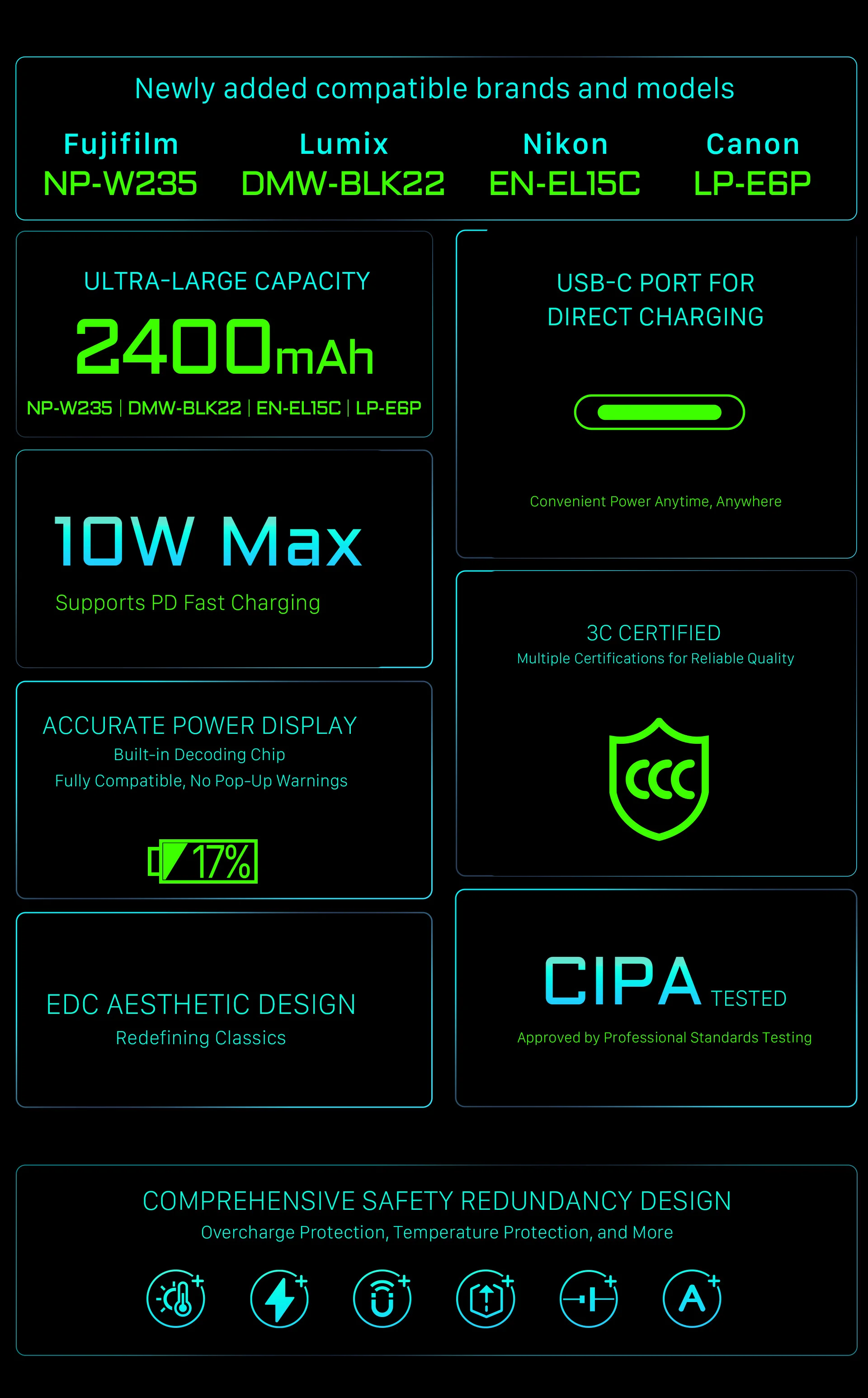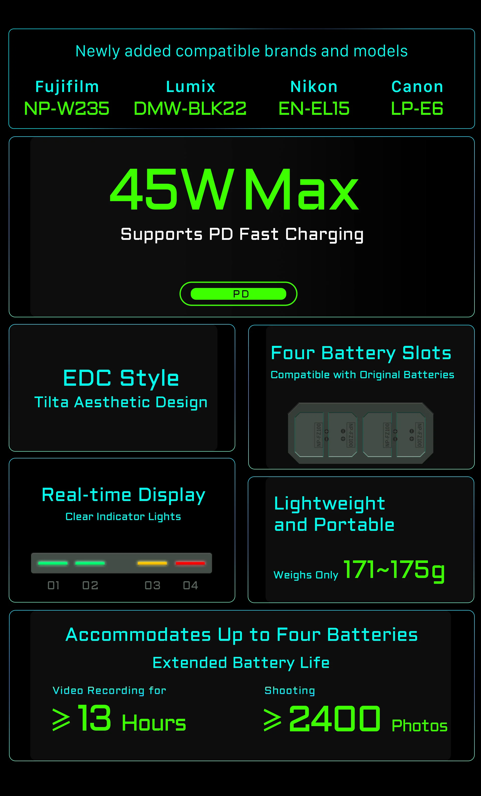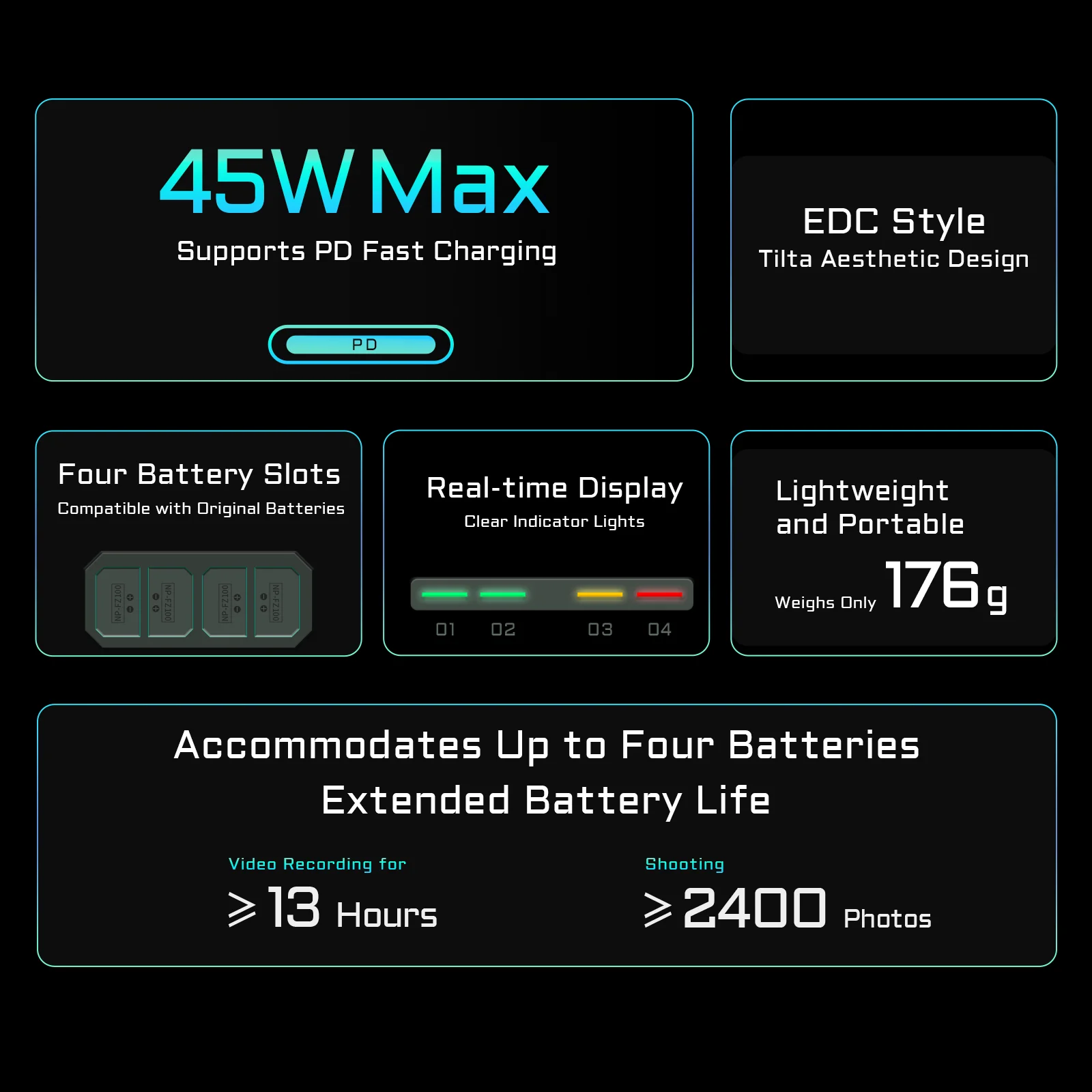 실시간 충전 상태 표시기를 통해 각 배터리의 상태를 알 수 있으며 가벼운 디자인으로 인해 장치의 무게가 176g에 불과해 휴대가 간편