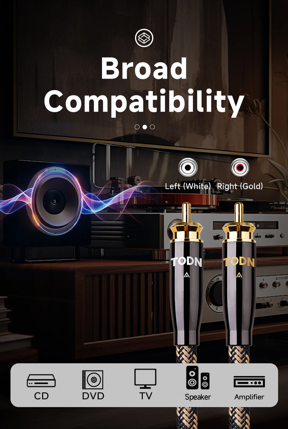 HiFi RCA 케이블 TODN 오디오파일 RCA 케이블은 뛰어난 음질을 제공 두꺼운 오노 연속 주조 구리 코어를 특징으로 하는 RCA 오디오 케이블은 강력하고 깊은 저음 풍부하고 완전한 중음역 및 선명하고 깨끗한 고음의 풍부한 디 을 제공 48시간의 번인(Burn in) 후 RCA RCA 케이블은 잠재력을 최대한 발휘하여 오디오 에게 이상적인 선택이 됩니다 더욱 강력하고 안정적인 연결 RCA RCA 오디오 케이블은 이중 차폐 RCA 케이블 디자인(오노 연속 주조 구리 편조 및 알루미늄 포일)을 특징으로 하여 E 및 RFI를 줄이고 신호 전송 안정성을 향상시켜 Hi Fi 사운드를 플러그 앤 플레이 RCA 남성 남성 케이블은 부식 방지 24K 금도금 순수 구리 플러그를 사용하여 안정적인 연결을 제공하고 신호 손실을 최소화하며 충실도를 향상시킵니다 향상된 전도성을 위한 순수 구리 쉘 오디오파일 RCA 케이블 설계부터 생산까지 TODN 하이파이 상호 연결 RCA 케이블은 순수 아날로그 신호 전송을 제공 2채널(좌우) 스테레오 RCA 케이블은 모든 음표의 세부 사항에 주의를 기울여 설계되었으며 사운드의 미묘함이 더욱 자연스럽고 매혹적입니다 오디오 를 위한 이상적인 선물 TODN Hi Fi 오디오 RCA 케이블은 오디오 를 위한 선물로 훌륭한 선택입니다 이 케이블 RCA는 RCA 케이블 자동차 오디오 DVD 플레이어 스피커 홈 시어터 등과 같은 RCA 인터페이스가 있는 장치와 호환됩니다