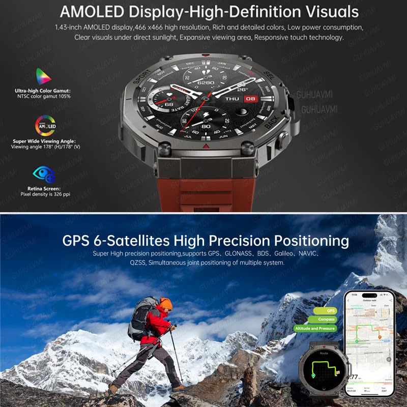 | T-Rex 3 GPS Smartwatch 1.43" AMOLED Screen 50m Waterproof 500 mAh Big Battery Outdoor Smart Watch for Men 2025 | T-Rex 3 GPS Smart Watch 5 ATM Waterproof Built-in Dual-band GNSS Compass Military Sport Smartwatch Men 2025 New for Xiaomi |