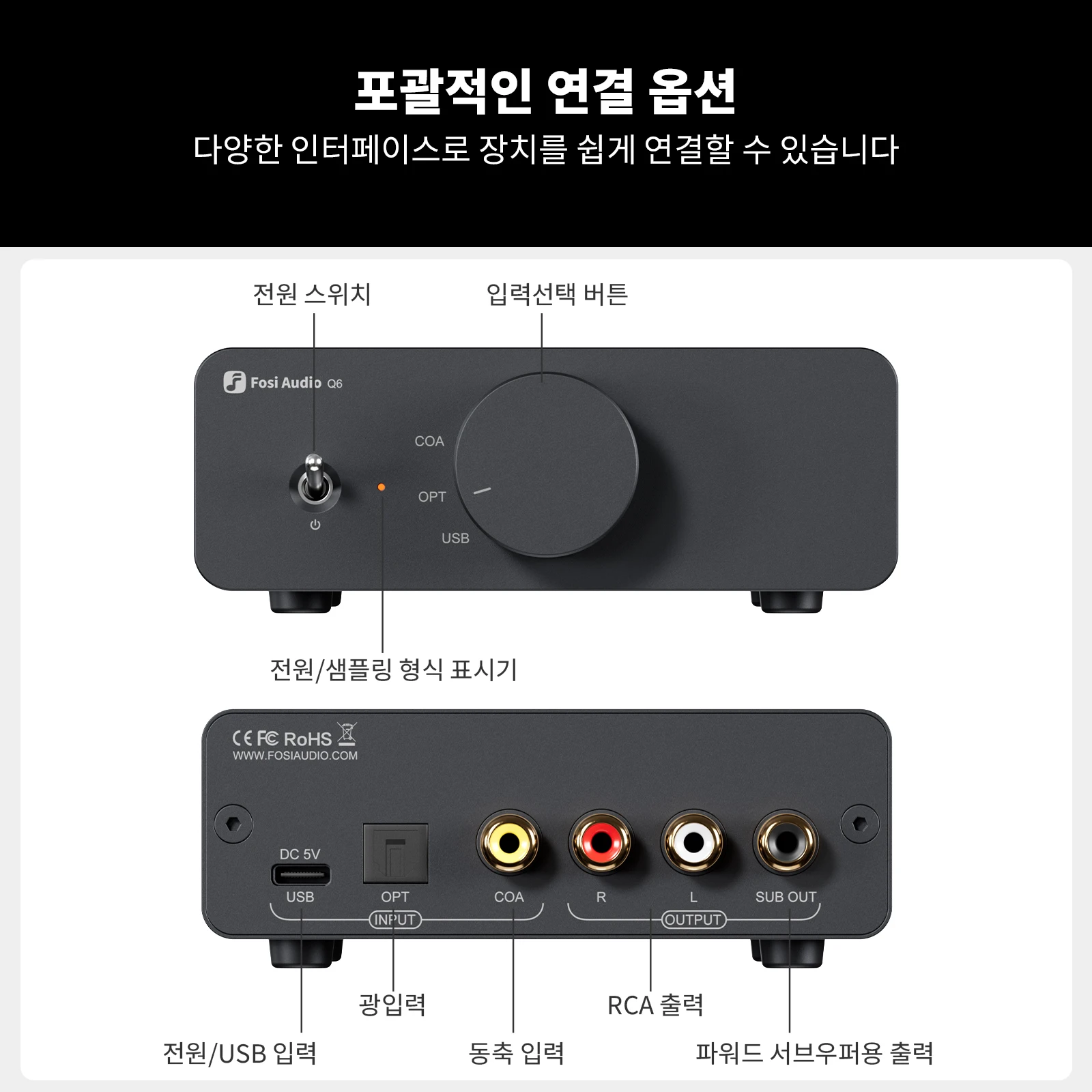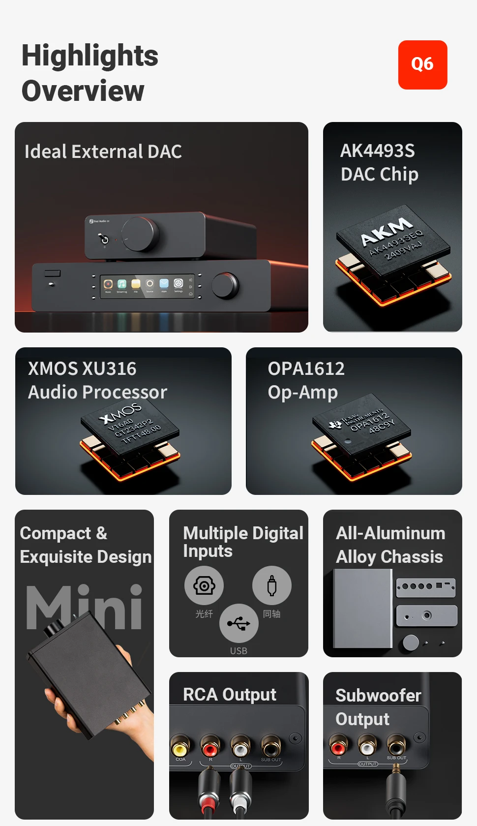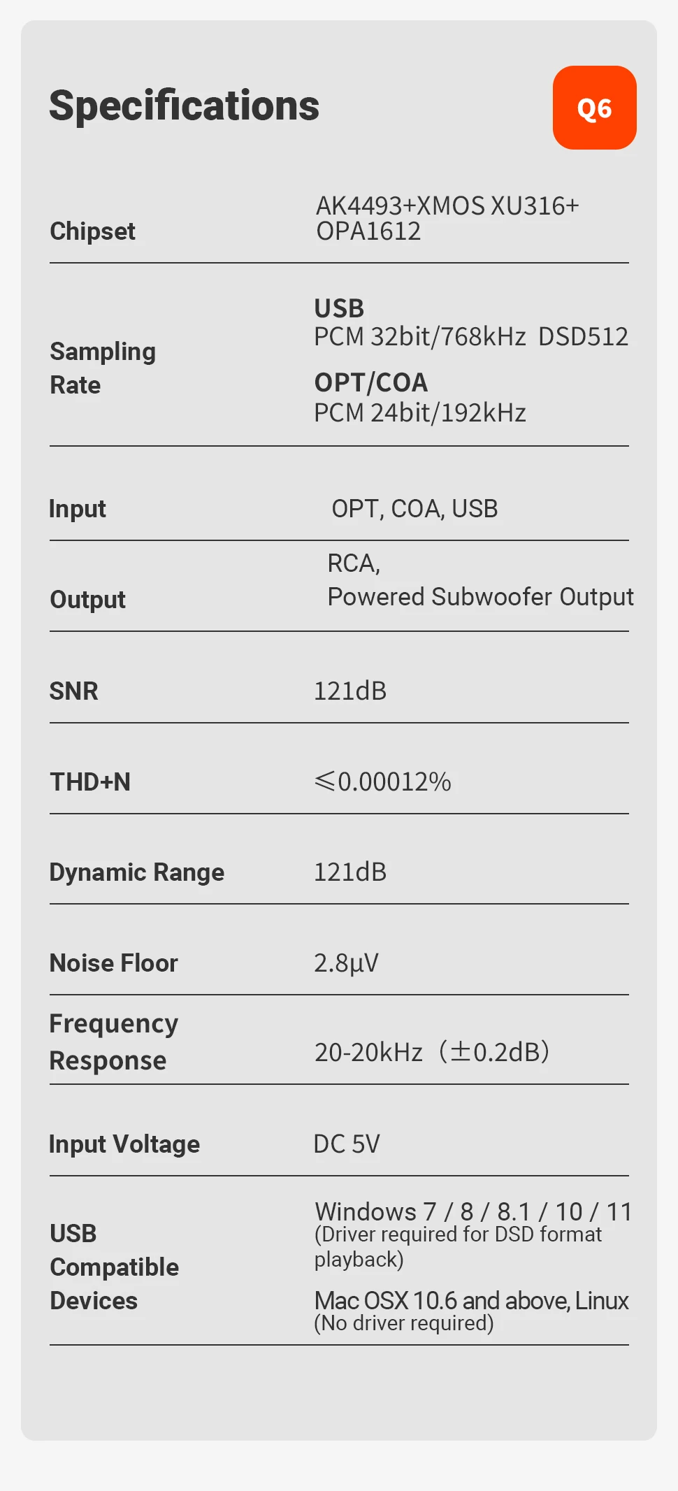 ? 뛰어난 오디오 성능? 초저가형이 특징0 00012 왜곡 121dB 신호 대 잡음비 그리고121dB 동적 범위 Q6는 뛰어난 깊이와 디 로 순수한 사운드 을 PCM 지원최대 768kHz/32Bit그리고DSD 512고해상도 음악 을 위해