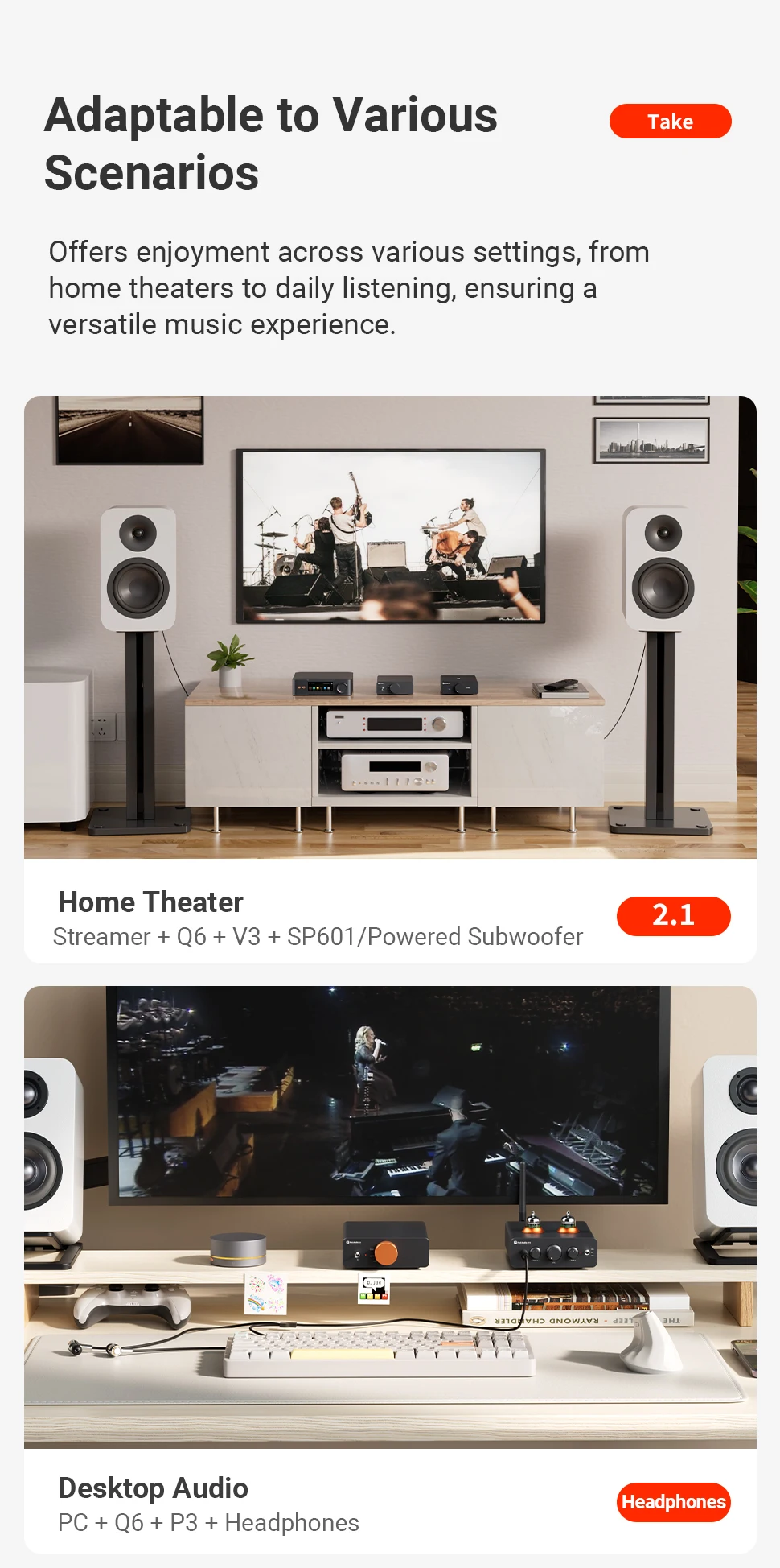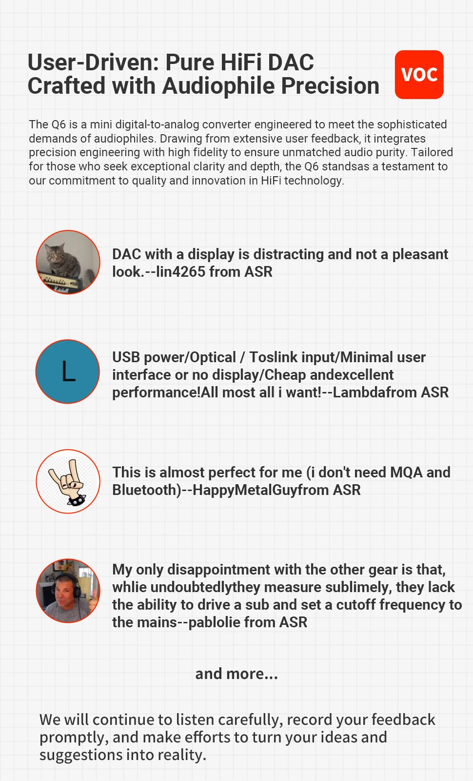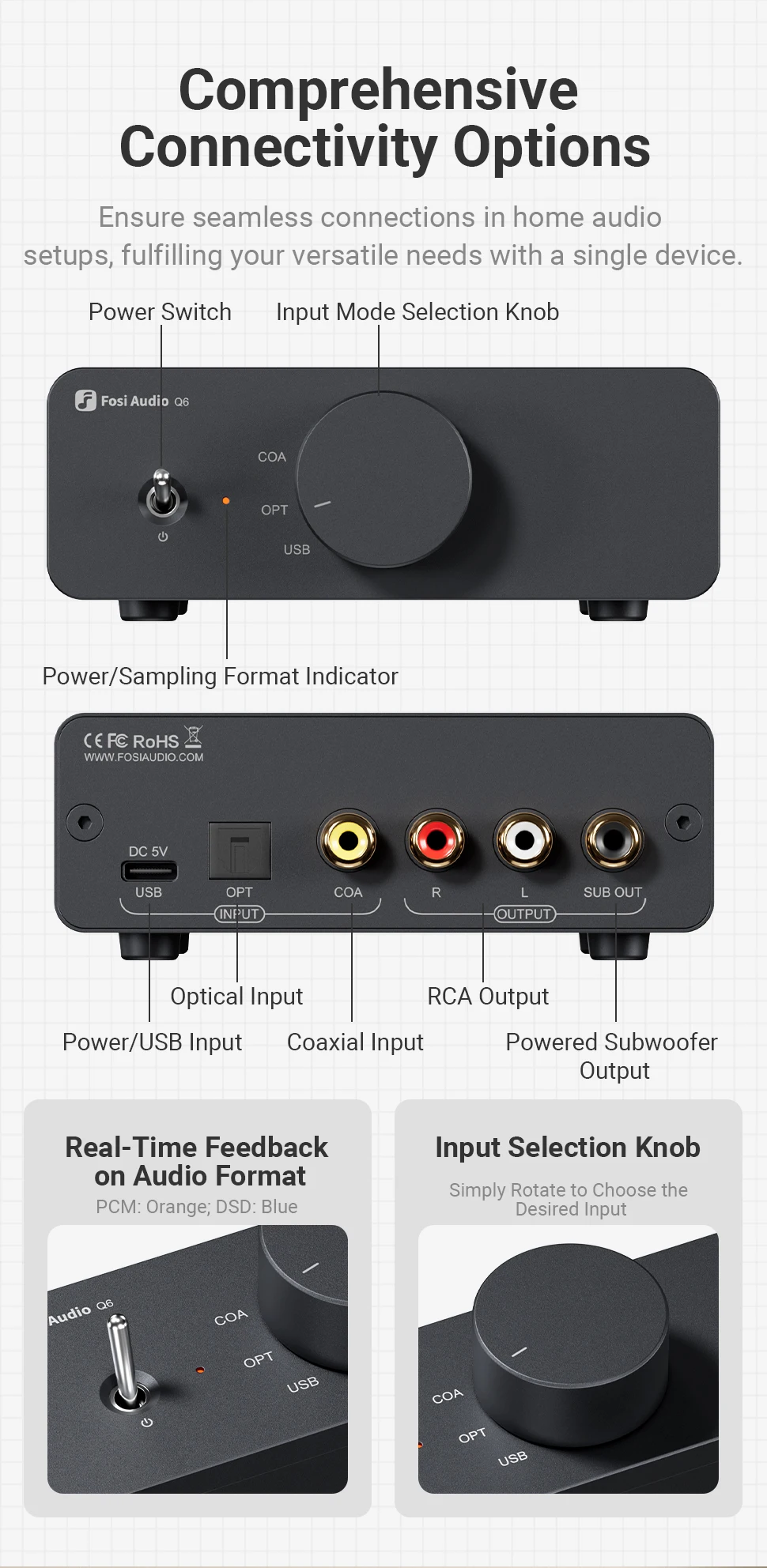 ? 뛰어난 오디오 성능? 초저가형이 특징0 00012 왜곡 121dB 신호 대 잡음비 그리고121dB 동적 범위 Q6는 뛰어난 깊이와 디 로 순수한 사운드 을 PCM 지원최대 768kHz/32Bit그리고DSD 512고해상도 음악 을 위해