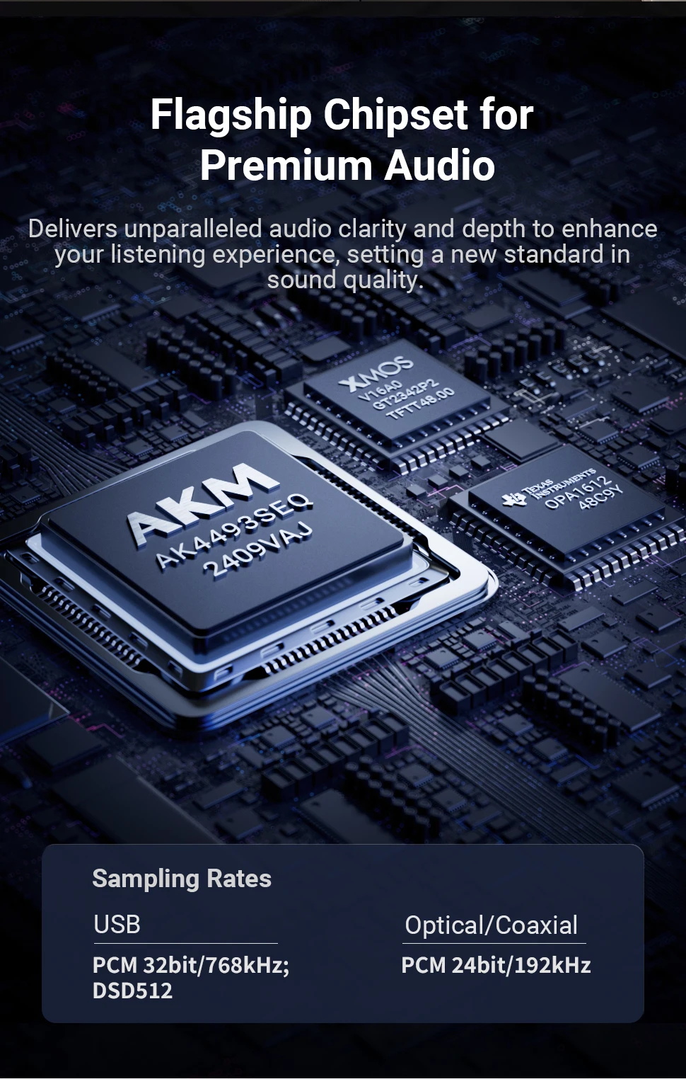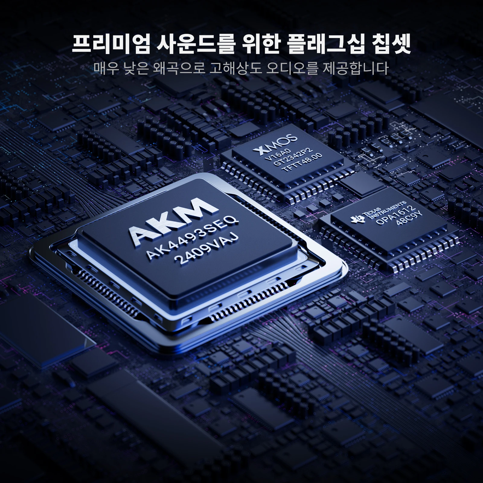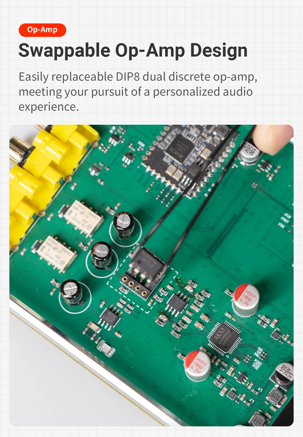 ?우수한 오디오 를 위한 플래그십 칩셋? 장착되어 XMOS XU316의 경우정밀한 디지털 신호 를 위한 프로세서AK4493S의 경우뛰어난 오디오 디 과 정확성을 위한 DAC 그것은OPA1612AIDR 및 NE5532DR연산 는 선명도와 과도 응답을 향상시켜 충실도가 높은 청취 경험을 제공