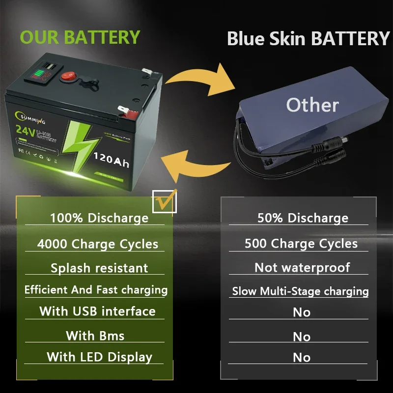 긴 사이클 수명 배터리로 4000회 이상의 사이클을 수행 있으며 기존 납산 배터리는 500사이클만 제공 당사의 24v 120Ah 배터리는 납산 배터리보다 환경 이고 안전