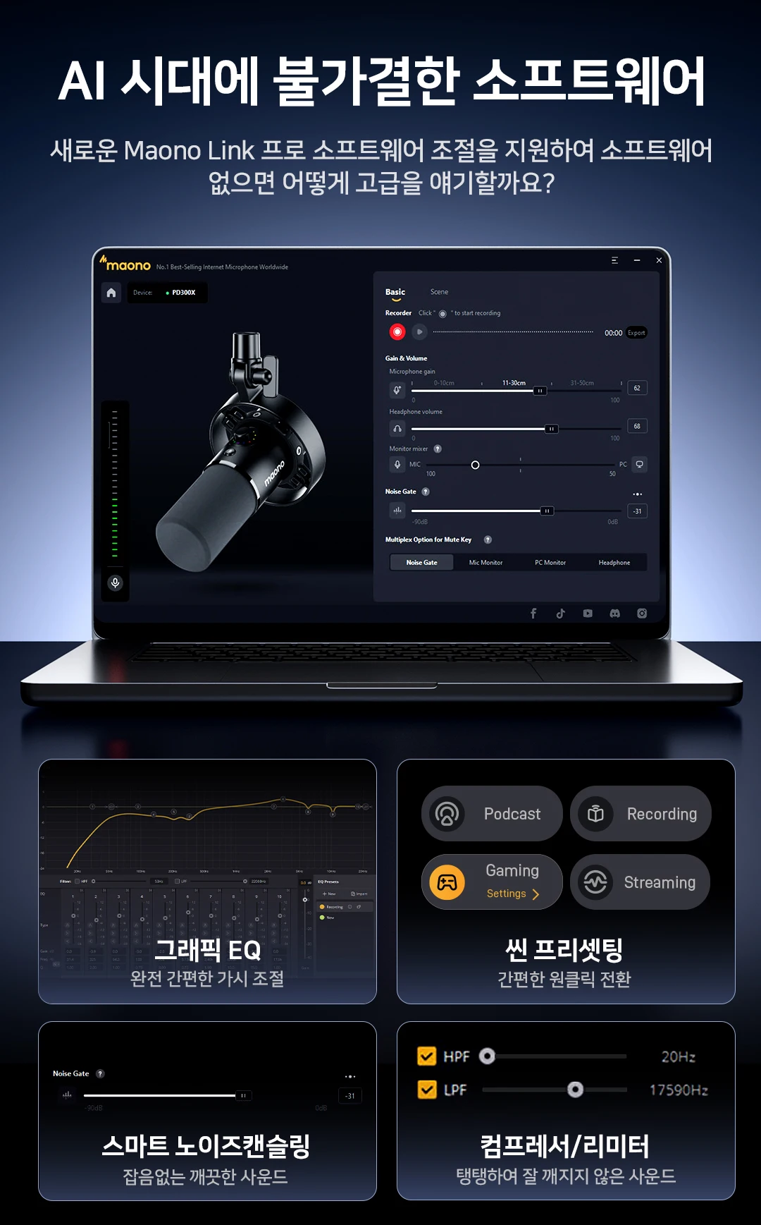 적인 오디오 당신만을 위한 다양한 리미터 및 하이패스 필터가 포함된 MAONO Link를 통해 유연하고 효율적인 작업 흐름을 즐겨보세요 시각적 EQ 조정 인터페이스를 통해 사운드 튜닝이 간단해졌습니다 매개변수를 하여 자신만의 사운드를 발견하고 자신만의 스타일로 팟 트를 만들 수 화된 톤을 얻기 위해 다른 미세 조정을
