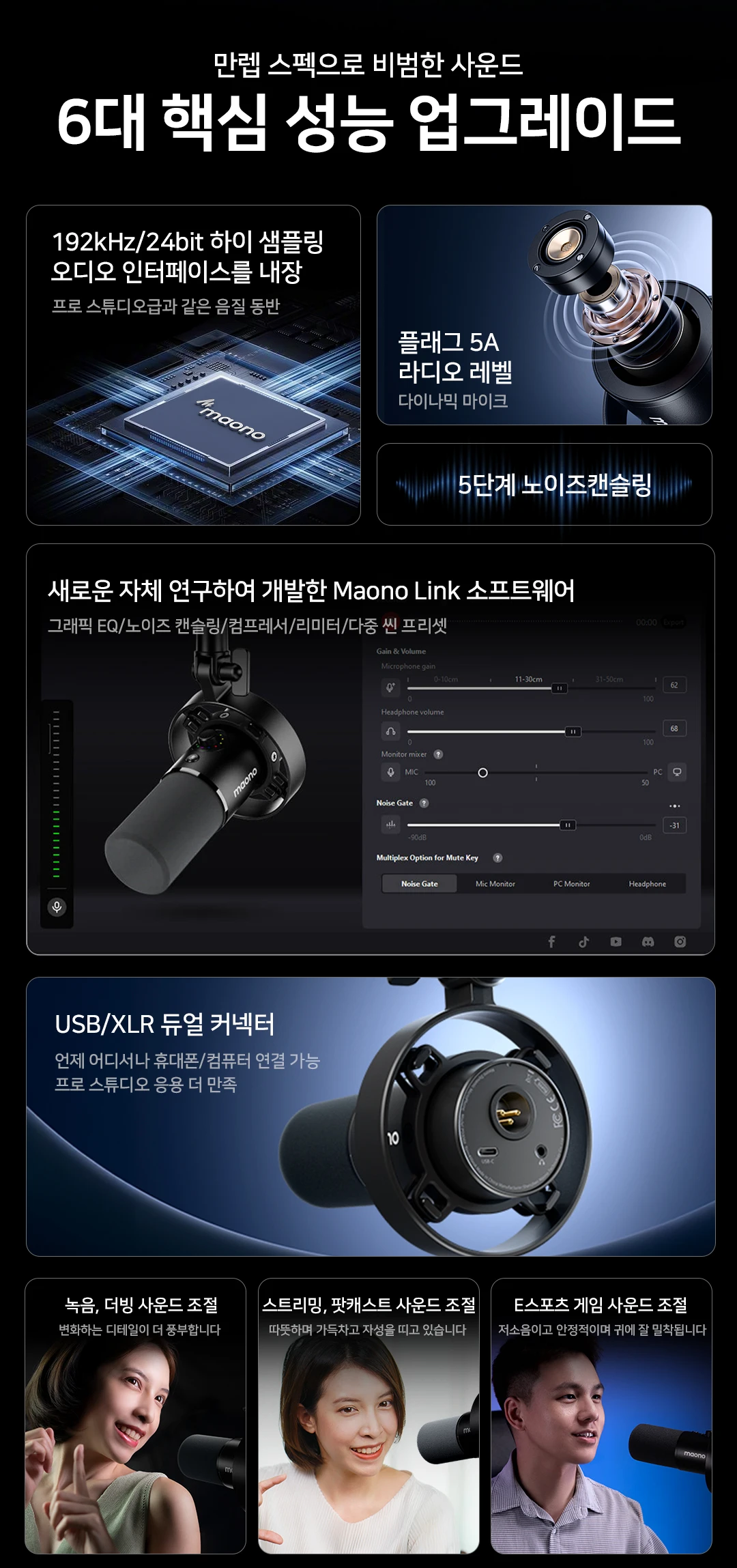 6가지 주요 업그레이드 적인 음질을 쉽게 즐길 수 초고해상도 192kHz/24비트 샘플링 속도와 시각적 그래픽 EQ 패널을 통해 모든 세부 사항이 선명 견고한 다이내믹 마이크 구조와 다차원 소음 감소 기술로 진정한 사운드 을 하여 더욱 선명한 톤을 구현 USB/XLR 듀얼 인터페이스는 다양한 장치에 대한 원활한 연결을 제공하며 4가지 사전 모드를 통해 다양한 요구 사항에 맞게 을 쉽게 전환