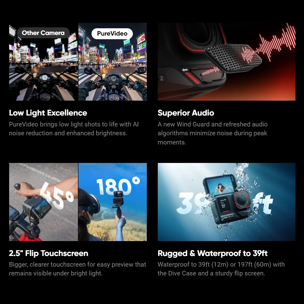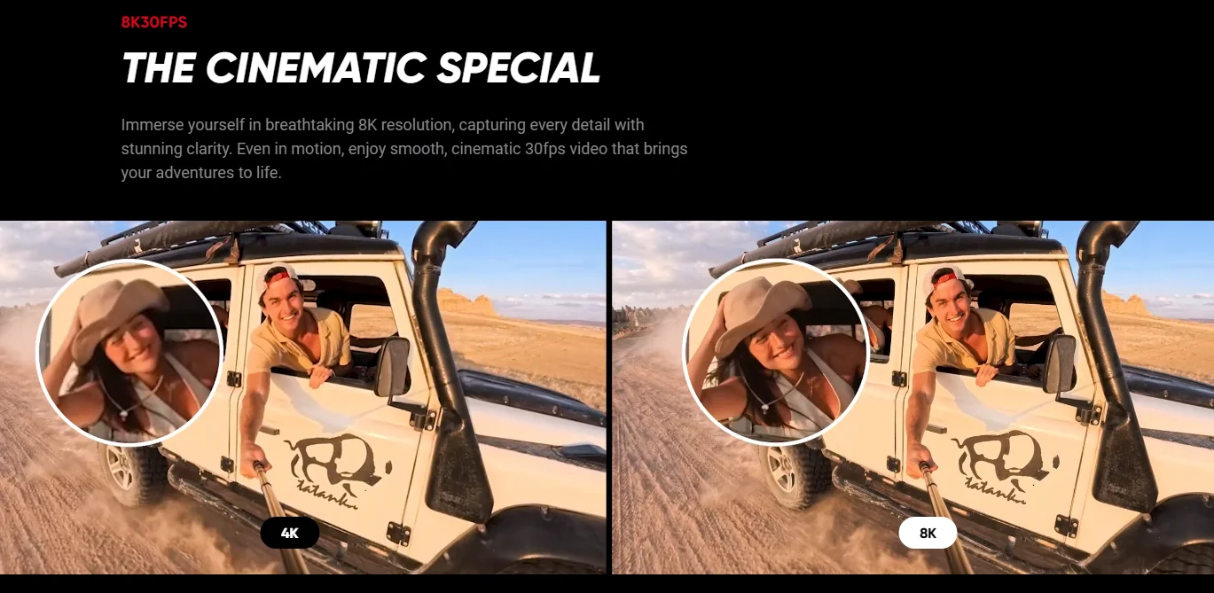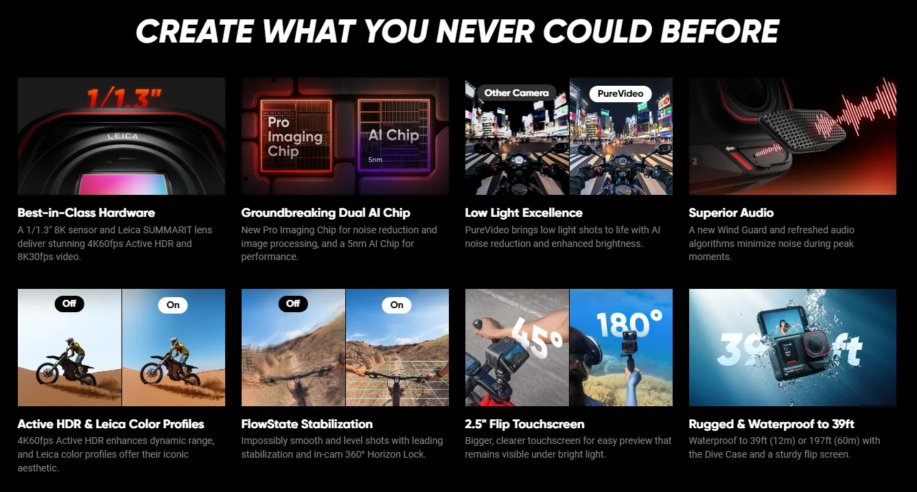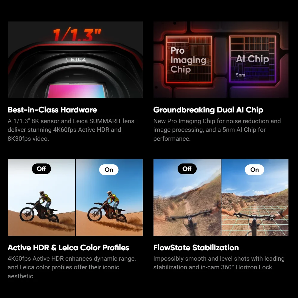 뛰어난 이미지 내구성 및 사용 편의성을 제공하는 이 다용도 액션 카메라는 액션 스포츠 여행 일상 생활 등 모든 환경에서 탁월한 성능을 발휘 차세대 1/1 3인치 8K 센서 SUMMARIT 업계 최초의 듀얼 Al 칩을 탑재하여 에도 부드러운 성능과 비교 없는 이미지 을 제공