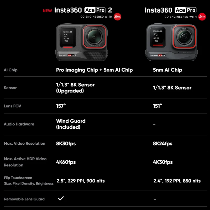두 액션 카메라의 가장 큰 차이점은 ta360 Ace 2는 업계 의 듀얼 AI 칩을 자랑하는 반면 ta360 Ace 는 5nm AI 칩을 하나 탑재했다는 점입니다 ta360 Ace 2는 또한 업그레이드된 1/1 3인치 8K 센서를 갖추고 있으며 포함된 마이크 캡으로 교체 있는 더욱 선명한 오디오를 위한 통합 윈드 가드 기능을 갖춘 최초의 액션 카메라입니다