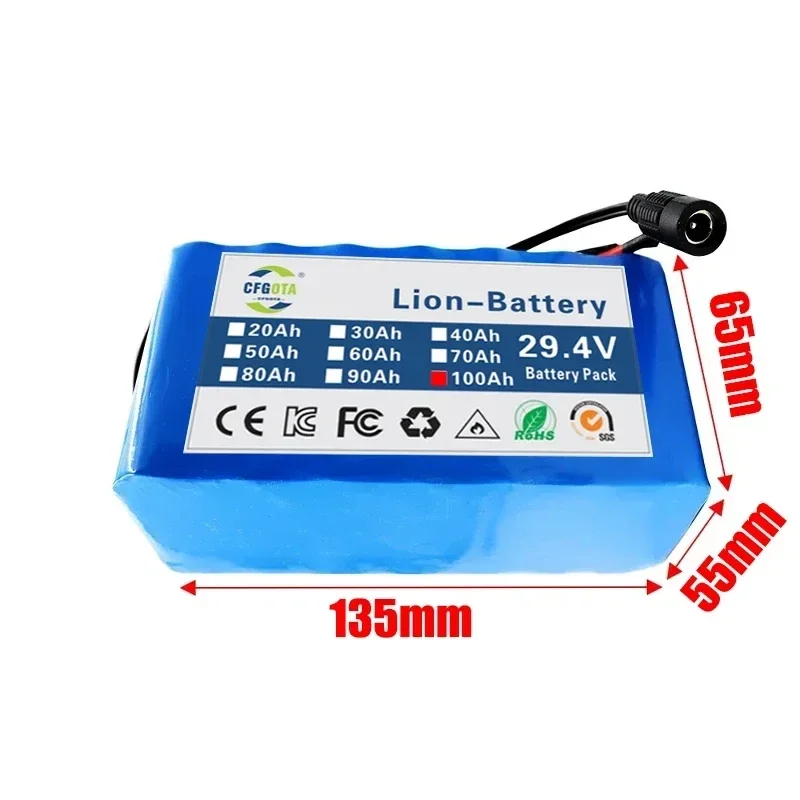 정격 전압 24 V 입력 전압 29 4v 출력 전압 21 V 29 4v 배터리 용량 100Ah 메쉬 130 58 68mm 배터리 무게 약 1 kg 보호 회로 충전 및 방전 과전류 단락 회로 보호 기능 등 D 포장 파란색 PVC 배터리 요구 사항 1 당신 LI ION 배터리 충전기 2 충전 전압 29 4 v 3 충전 전류 4 이하 배터리 방전 요구 사항 1 18 라인 중 150mm 길이 빨강 및 검정 2 라인 2 1 소켓 150mm 길이 3 최대 순간 전류 60 4 최대 작동 전류 45 5 제품 내장 충전식 배터리 목록 1 1pcs 24 v (29 4v) 100Ah 배터리 팩 (BMS ) 2 1 개 29 4v 충전기(유럽 플러그는 기본적으로 전송됩니다 플러그가 저희에게 감사 )