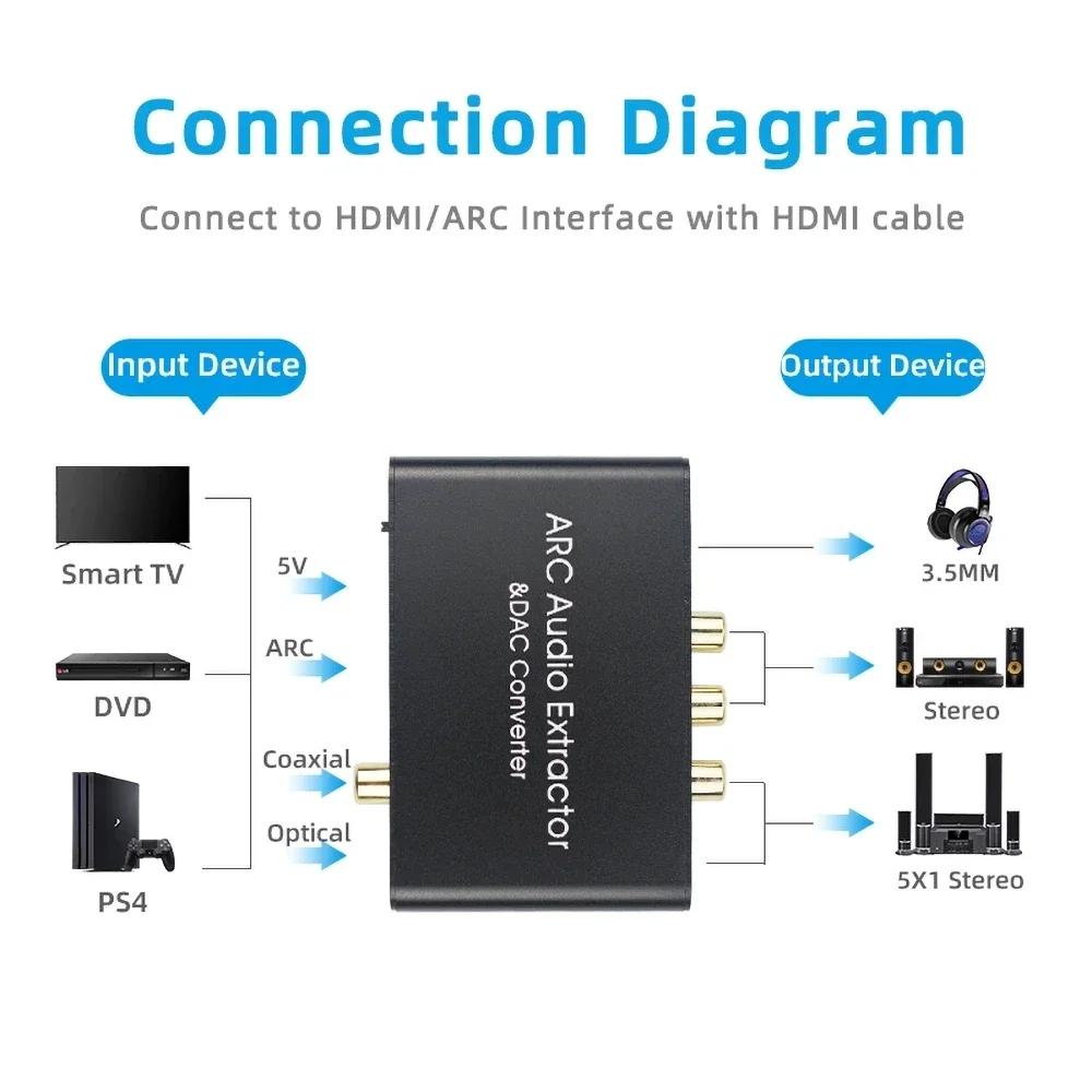 HD 호환 오디오 리턴 및 디지털 아날로그 오디오 변환기는 HD 호환 ARC 인터페이스를 통해 TV 사운드를 광섬유 동축 3 5mm 동축 폰 잭(동시에 사운드 출력 가능)으로 출력 또한 디지털 오디오 광섬유 또는 동축 신호를 아날로그 스테레오 신호로 변환하는 기능도 지원