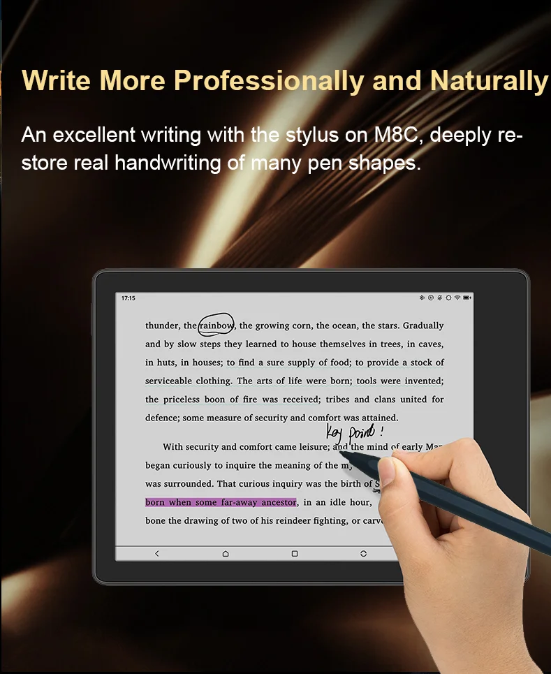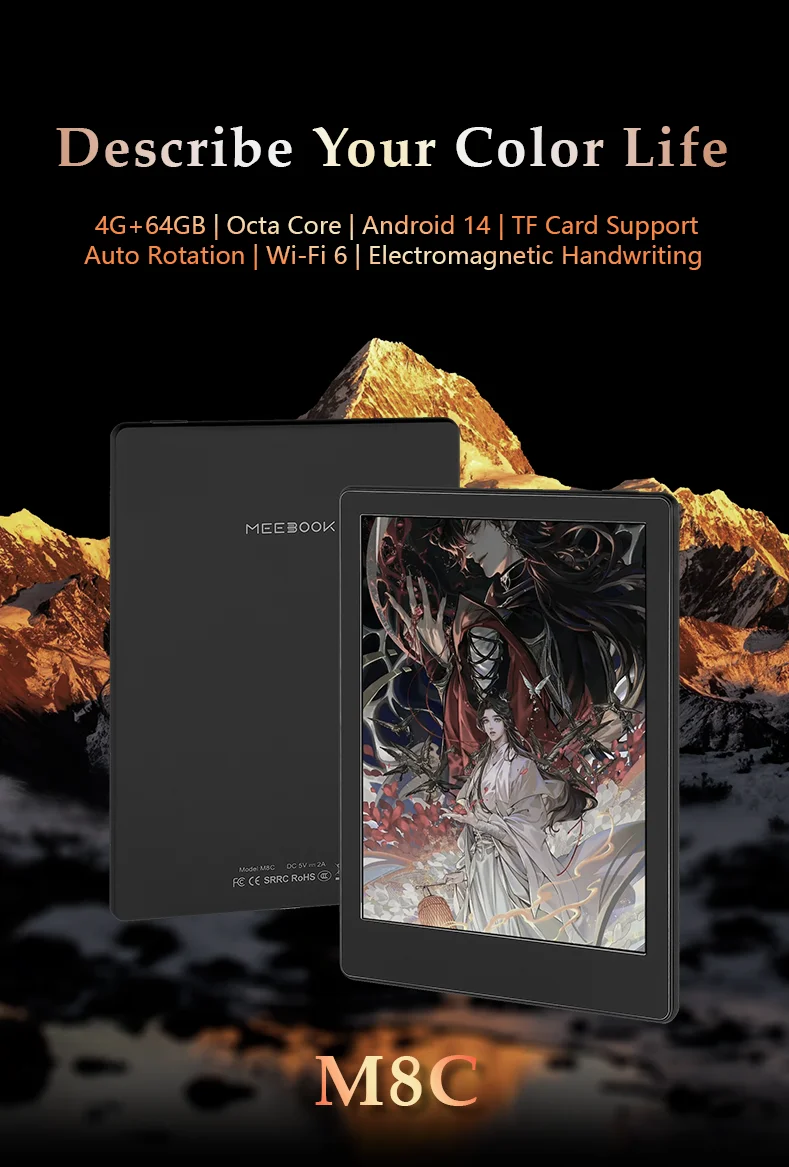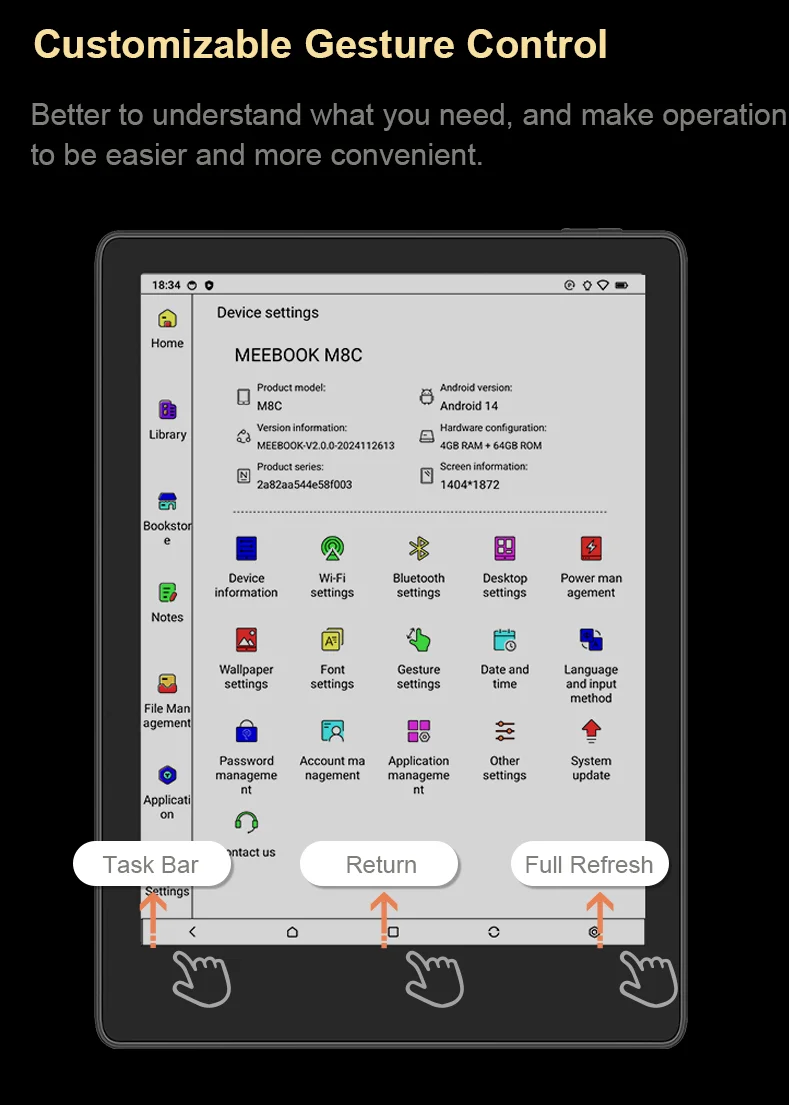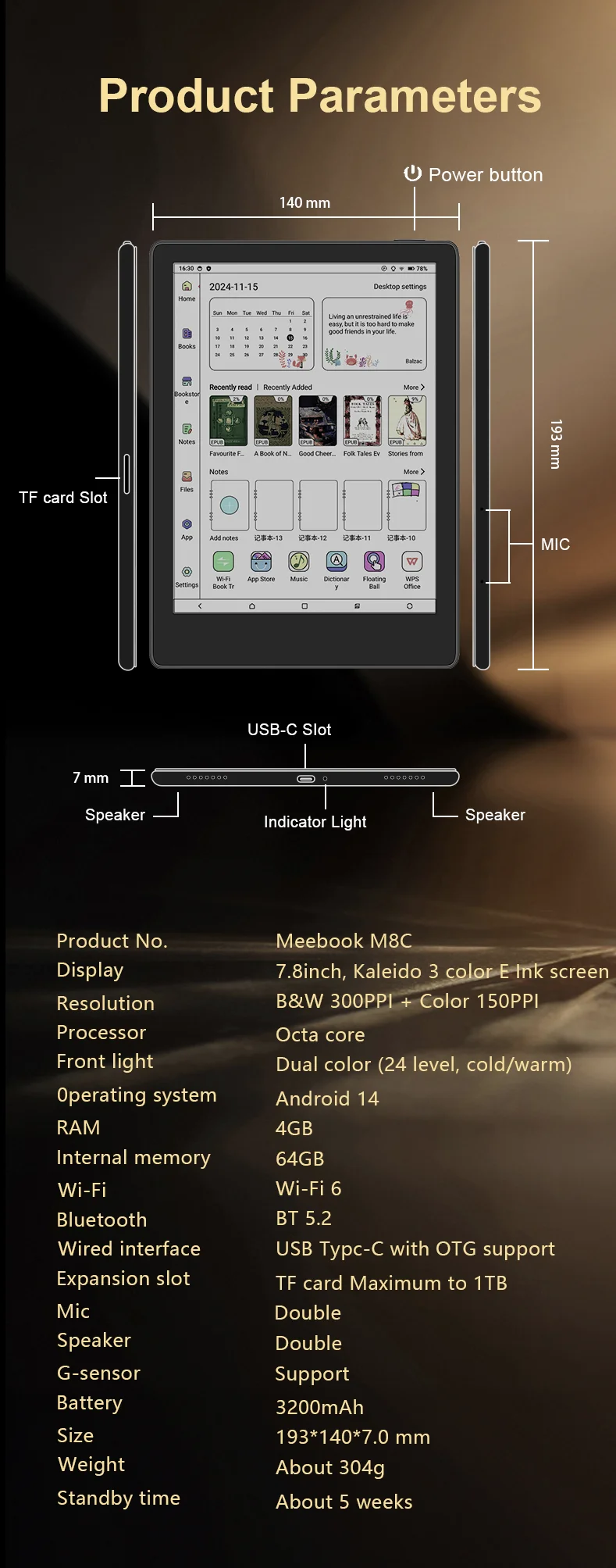 Meebook m8C는 옥타 코어 2 2GHZ C 4GB RAM 및 64GB 메모리와 외부 TF 카드 슬롯을 갖춘 컬러 잉크 칼레이도 3로 상당히 큰 저장 공간을 제공 펜과 함께 장치를 사용하면 메모를 작성하고 생각나는 모든 아이디어를 적을 수 새로운 펌웨어에는 어두운 환경에서도 조명을 켜는 기능 원버튼으로 홈으로 돌아가는 기능 등 다양한 편리한 제스처 제어 기능이 내장되어 GOOLE PLAY는 이미 내장되어