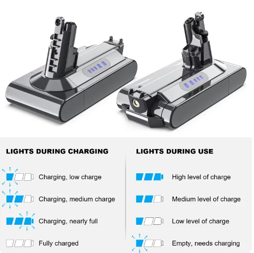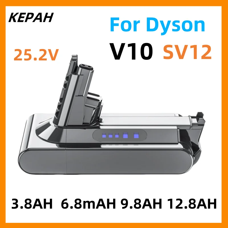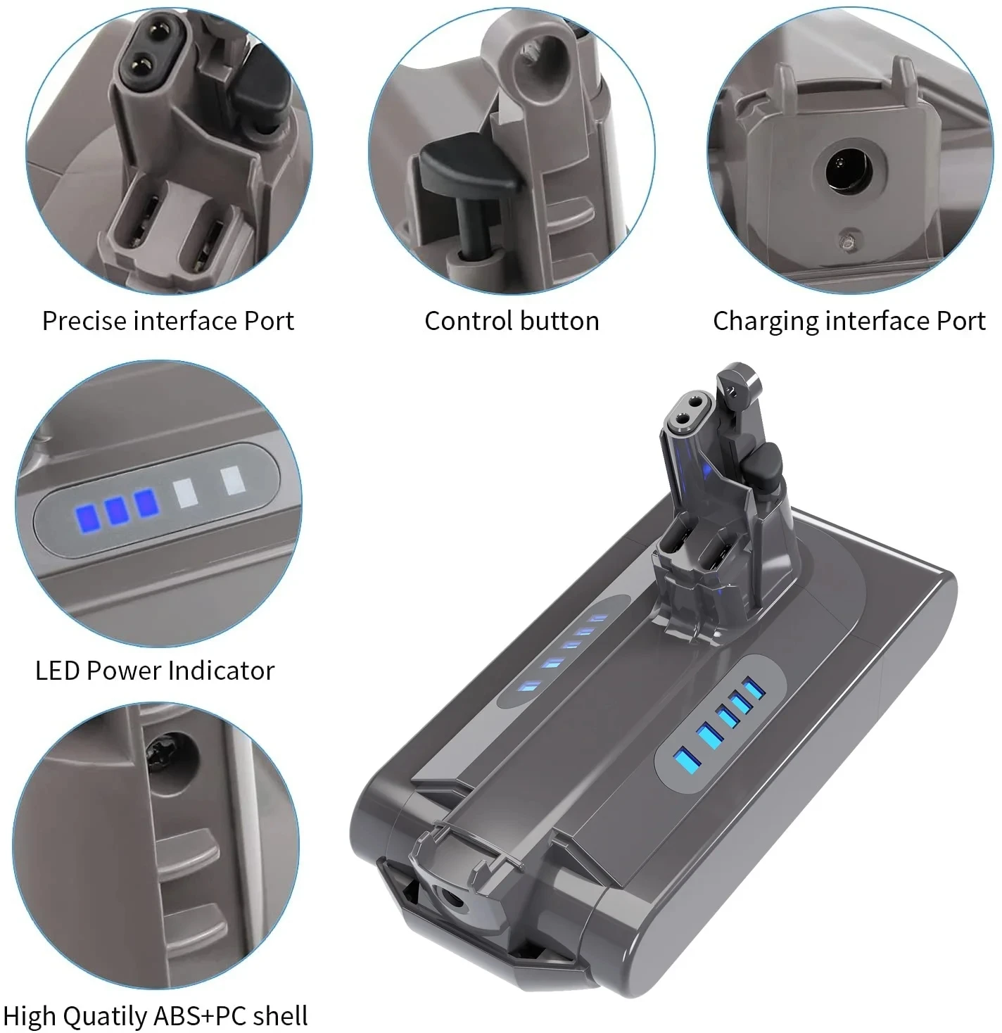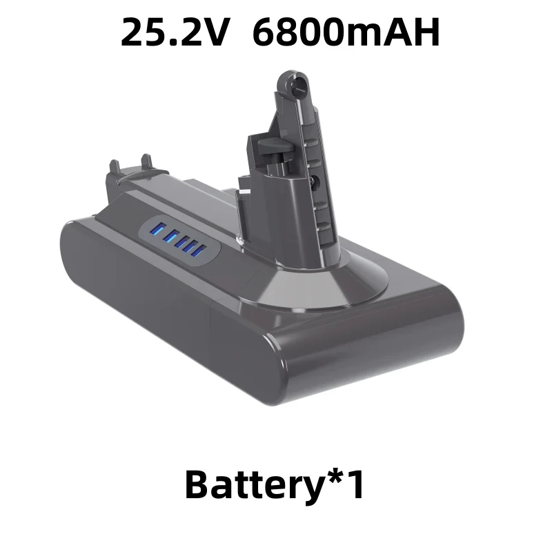 e V10 6 8Ah 더 높은 용량 용량 6000mAh / 충전식 이온 / 전압 25 2V V10용 배터리는 V10급속 충전기로 약 2 8시간 동안 충전 진공청소기 최대 모드 3분 일반 모드 30분 메모리 효과가 없습니다 진공청소기가 더 오래 작동 있는 고용량입니다