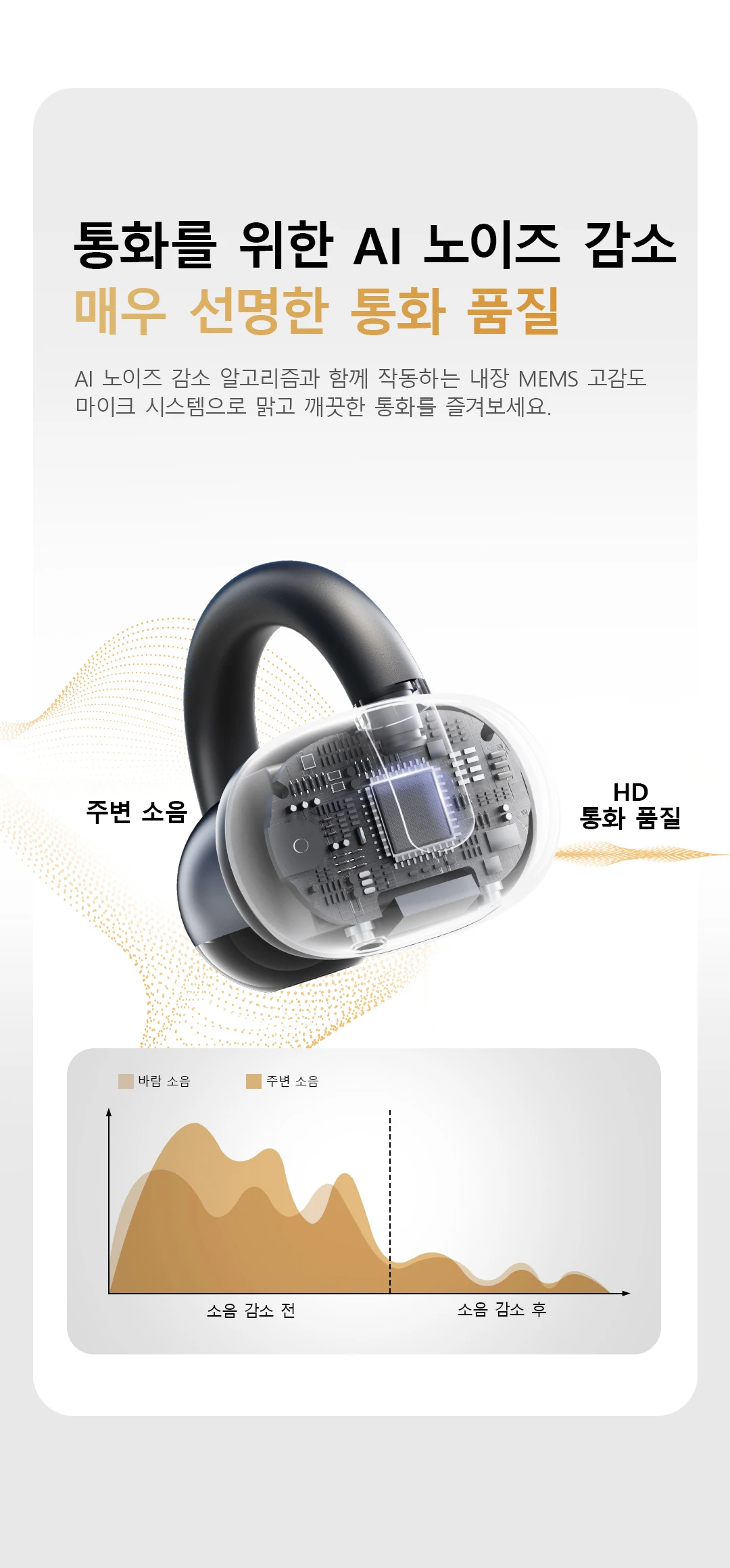 Al 노이즈 감소 알고리즘과 함께 작동하는 내장 MEMS 고감도 마이크 시스템으로 맑은 통화를 즐기십시오