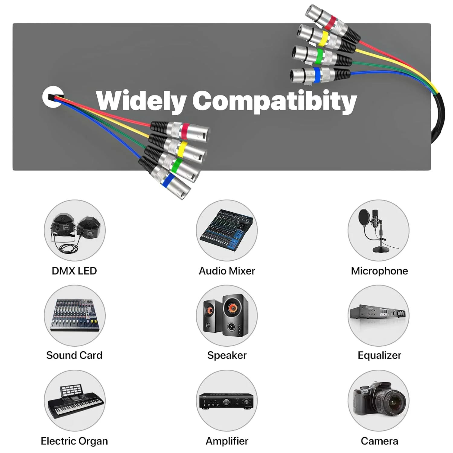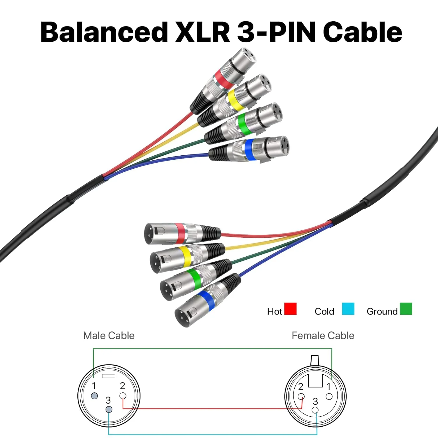?[Colored 3 Pin Snake Cables] Multiple colored coded cables are designed with 4 different colored XLR male and female connectors (red yellow green blue) to help you easily identify or match phones xing boards and jumper holders frames and other connectors The s er cable can be used with a device equipped with a 3 Pin female XLR to male XLR