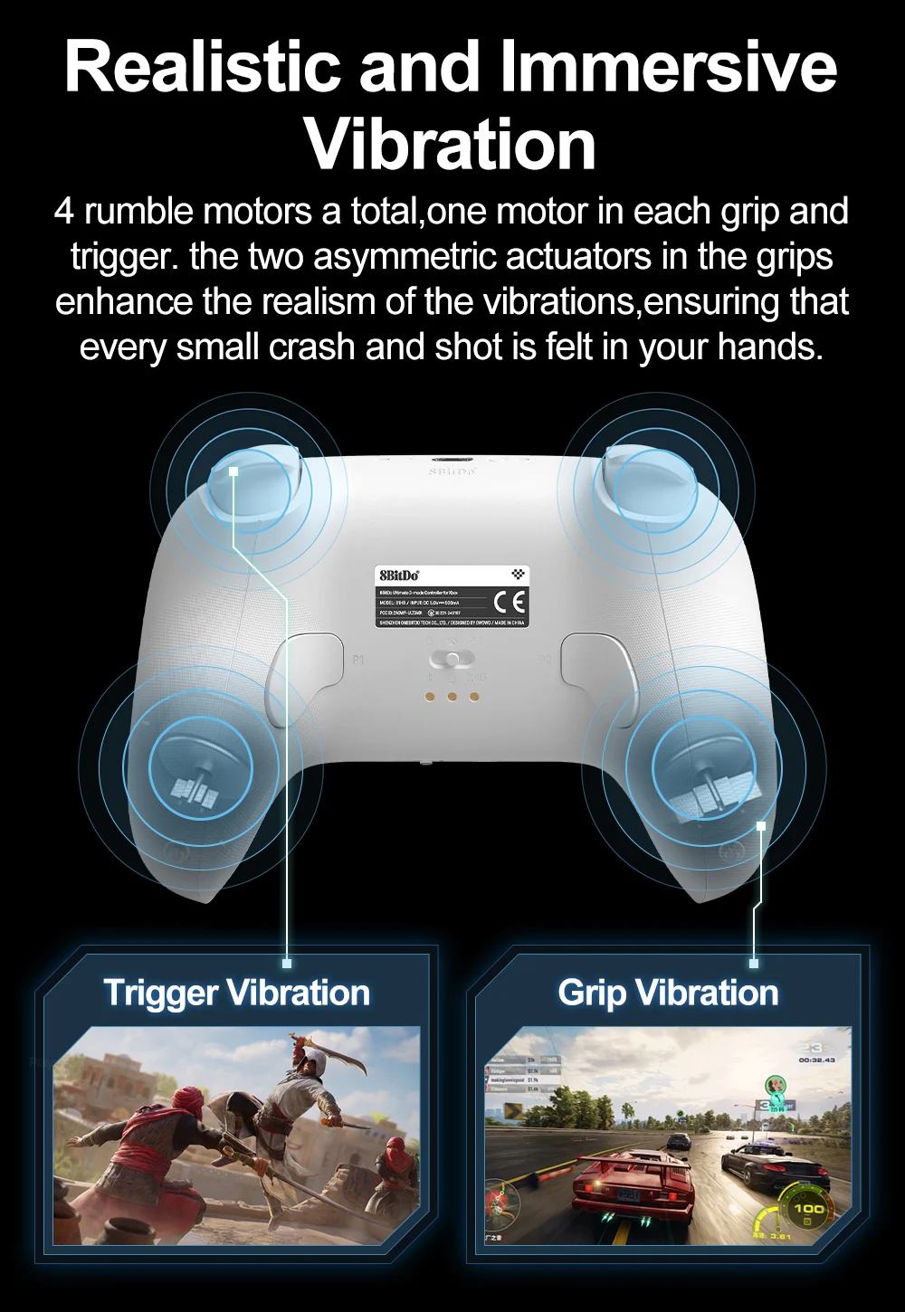 4 럼블 모터 각 그립과 에 하나의 모터가 그립에 있는 두 비대칭 액추에이터는 진동의 현실감을 향상시켜 모든 작은 충돌과 사격이 손에 느껴지도록