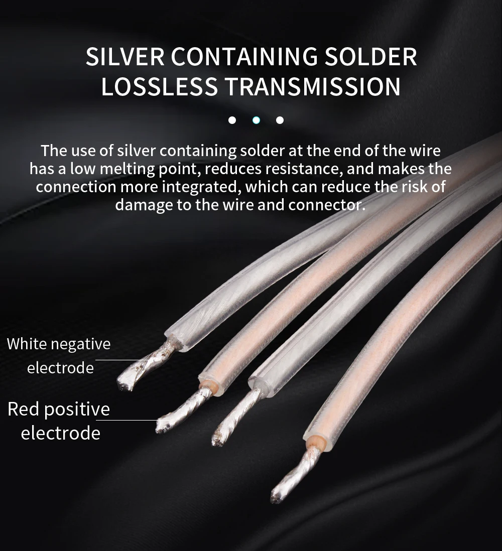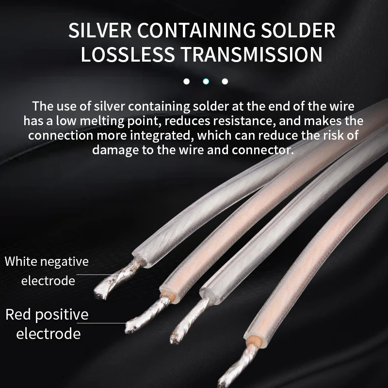 와이어 끝에 은 함유 땜납을 사용하면 융점이 낮고 저항이 감소하며 연결이 더욱 통합되어 와이어와 커넥터가 손상될 위험이 줄어듭니다