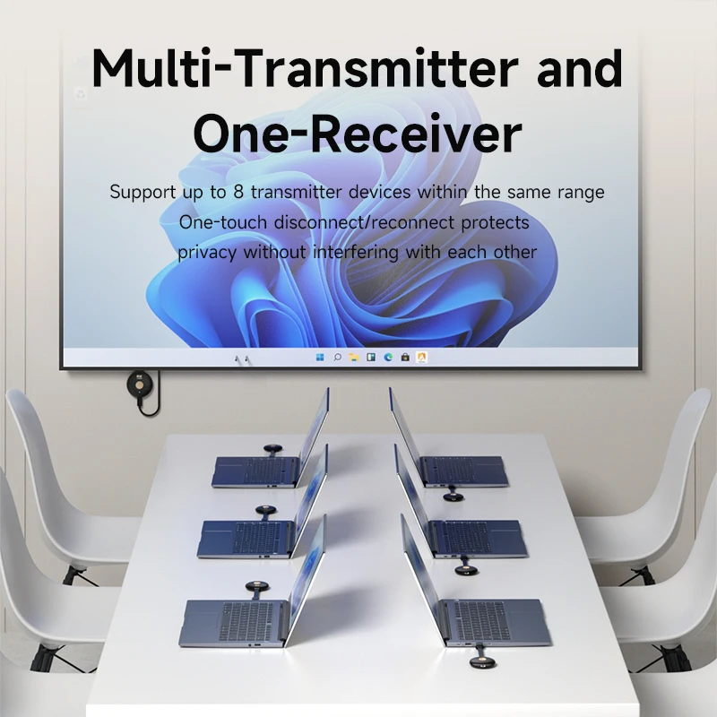 최대 8 송신기 지원 하나의 수신기는 최대 8 송신기 연결을 지원하므로 송신기의 버튼을 클릭하여 대형 화면 이미지 간에 전환 있어 회의 효율성이 향상됩니다