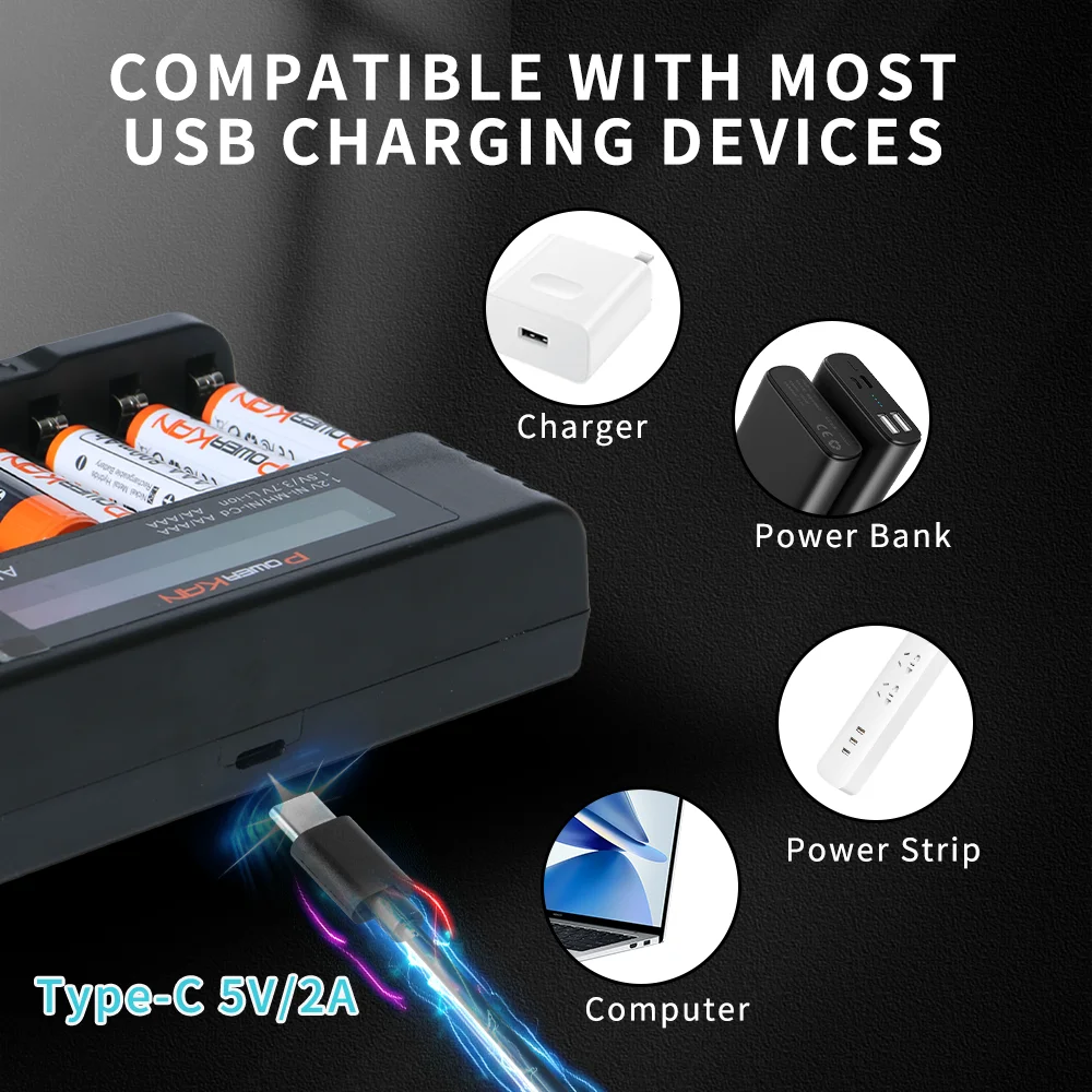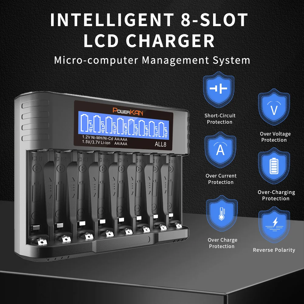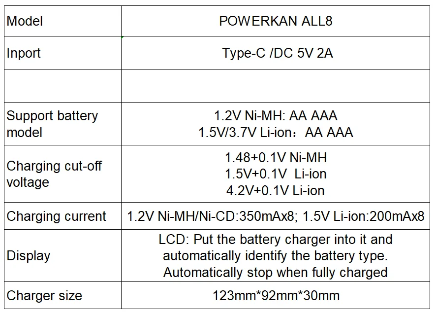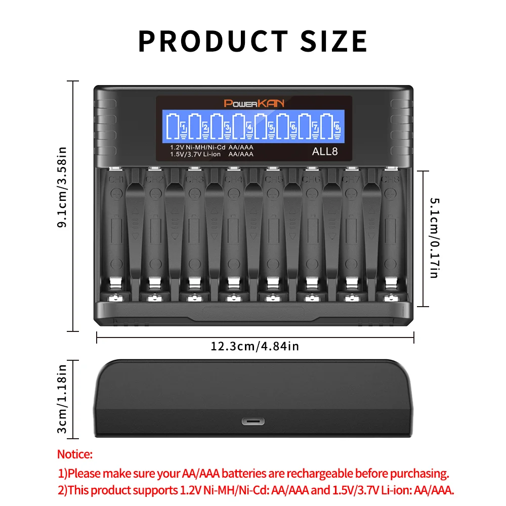 1 This duct can independently charge 1/2/3 8 cells of 1 2V Ni MH/Ni CD AA AAA rechargeable batteries and 1 5V/3 7V lithium ion AA AAA rechargeable batteries (Ni MH/Ni CD Can be charged simultaneously with lithium ion batteries)