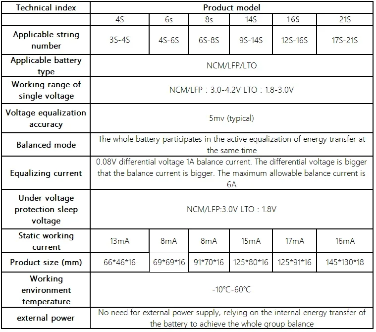 균형 전류 0 5 5A 배터리의 균형이 잡힐수록 전류는 작아지고 수동 절전 스위치를 사용하면 절전 전류 모드는 0 1mA 미만이며 밸런스 전압 정확도는 5mv 이내입니다