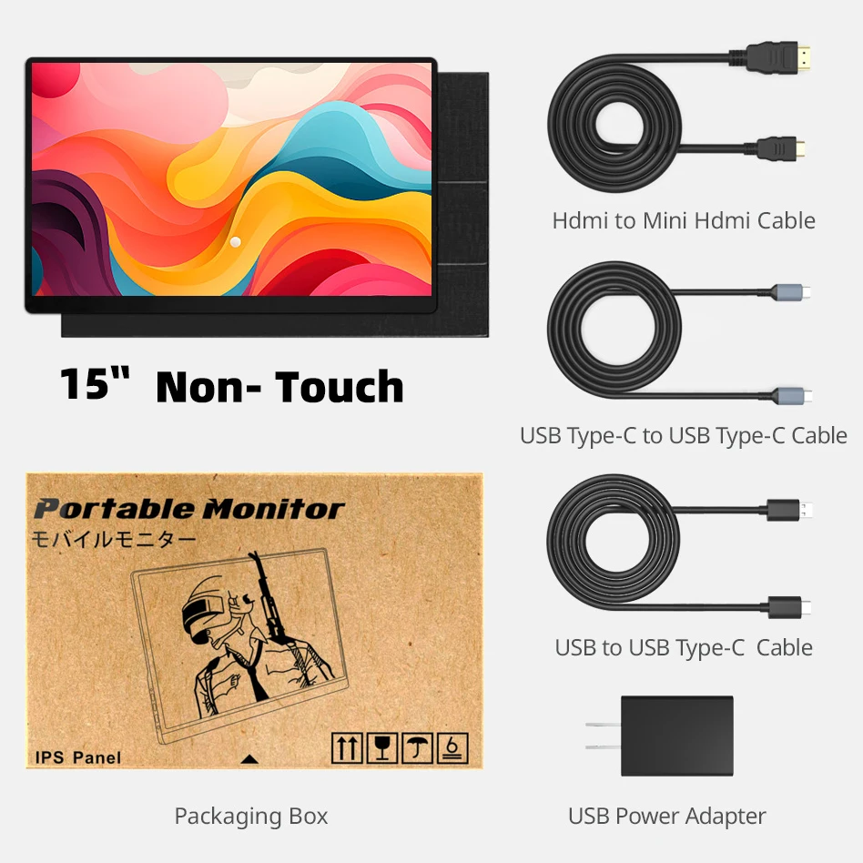 휴대용 모니터/보호 커버/USB C USB C 케이블/USB C 케이블/미니 HD 케이블/전원 어댑터/사용 설명서