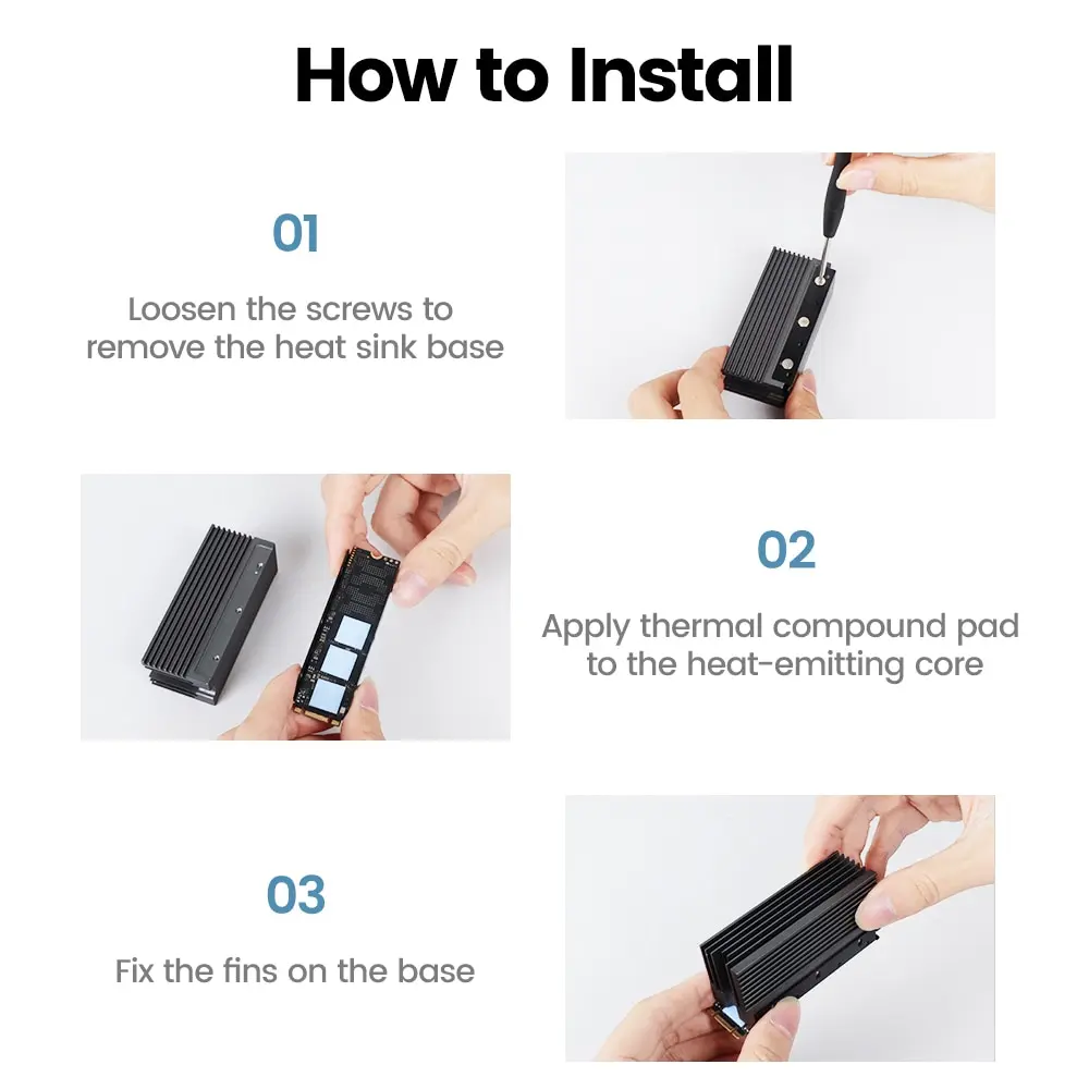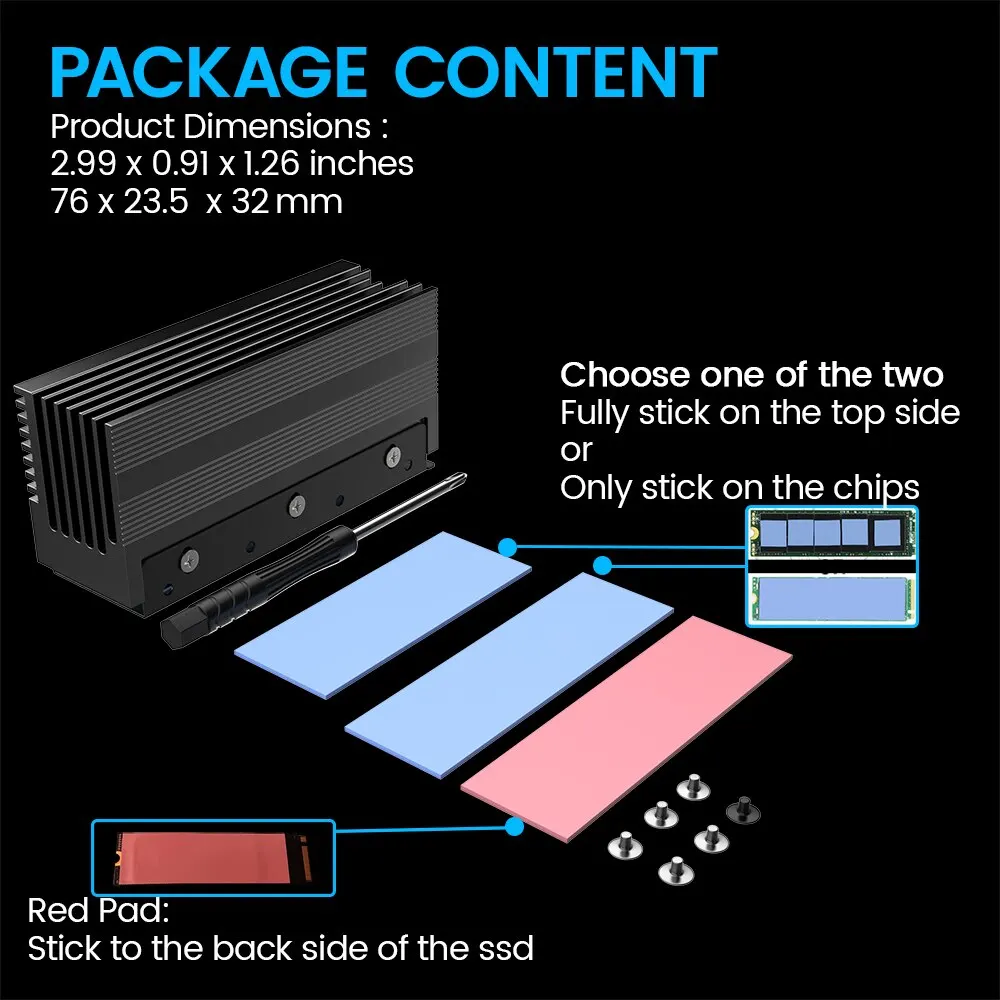 3 방열판에는 나사 고정 프레임이 있으며 SSD의 접촉 간격을 채울 수있는 두 고 전도성 열 화합물 패드가 포함되어 나사를 조이면 SSD의 열 방출이 빨라지고 부드러운 열 복합 패 인해 솔리드 히트 싱크 받침대가 SSD에 손상 없이 부드럽게 닿을 수