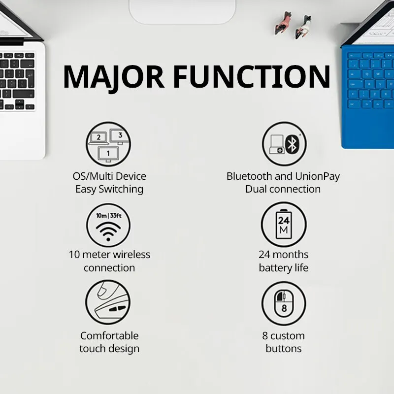 주요 기능 여러 장치의 손쉬운 전환 Bluetooth와 Youlian의 이중 연결 10미터 무선 연결 24개월의 배터리 수명 편안한 느낌의 디자인 및 8 버튼