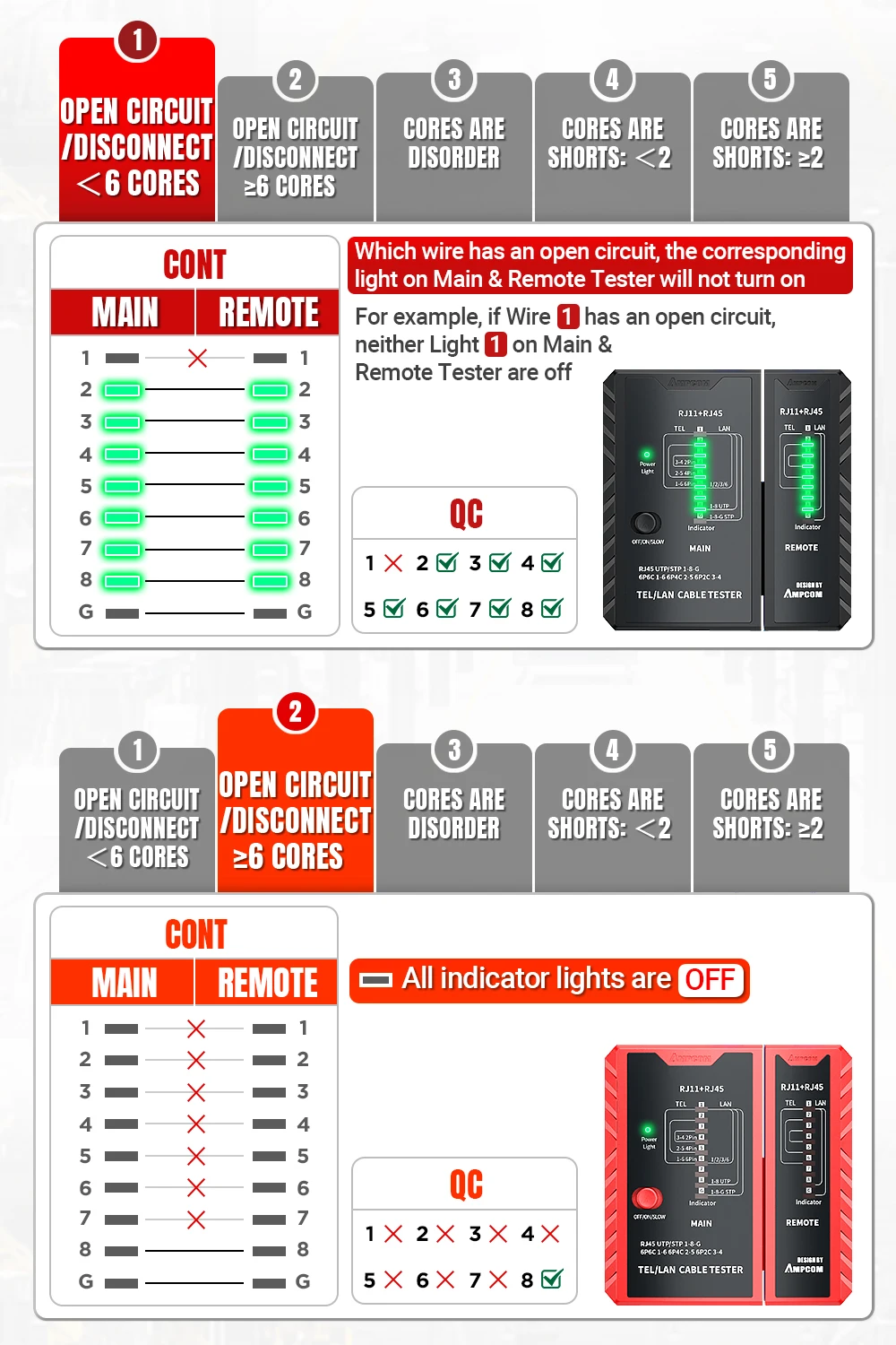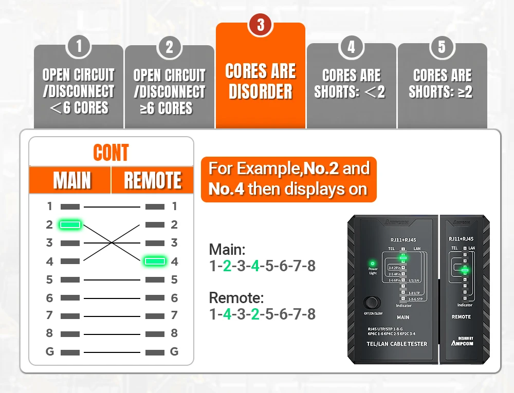 예를 들어 케이블 NO 3이 개방 회로인 경우 메인 테스터와 원격 테스터의 NO 3 표시등 2개가 켜지지 않습니다