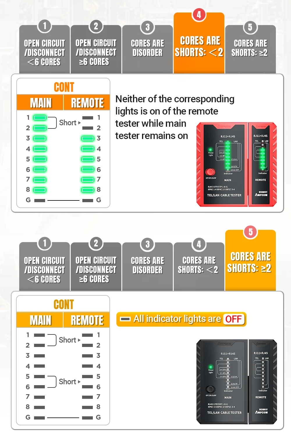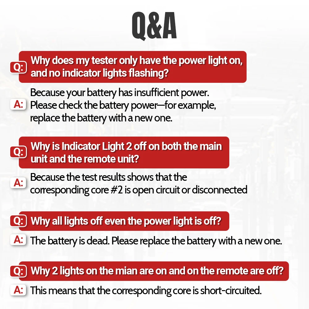 두 케이블이 단락되면 리모트 테스터의 해당 표시등이 켜지지 않으며 메인 테스터는 변경되지 않습니다 세 케이블을 포함하여 세 케이블이 단락되면 해당 램프는 모두 켜지지 않습니다