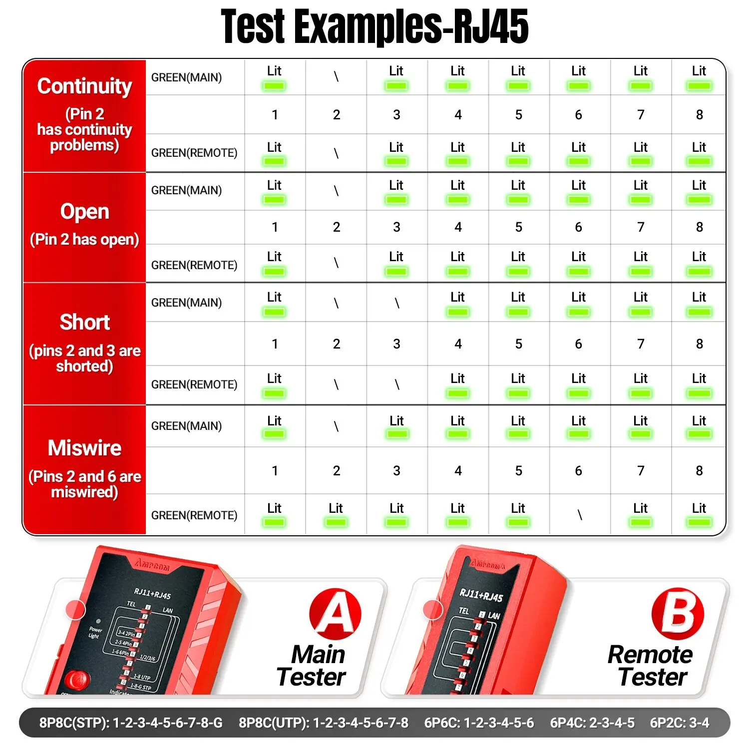 RJ11/RJ12/RJ14 전화선 및 RJ45 LAN 케이블용 케이블 테스터로 문제 있는 단락 개방형 전선 교차 쌍 및 기타 배선 오류를 찾아냅니다